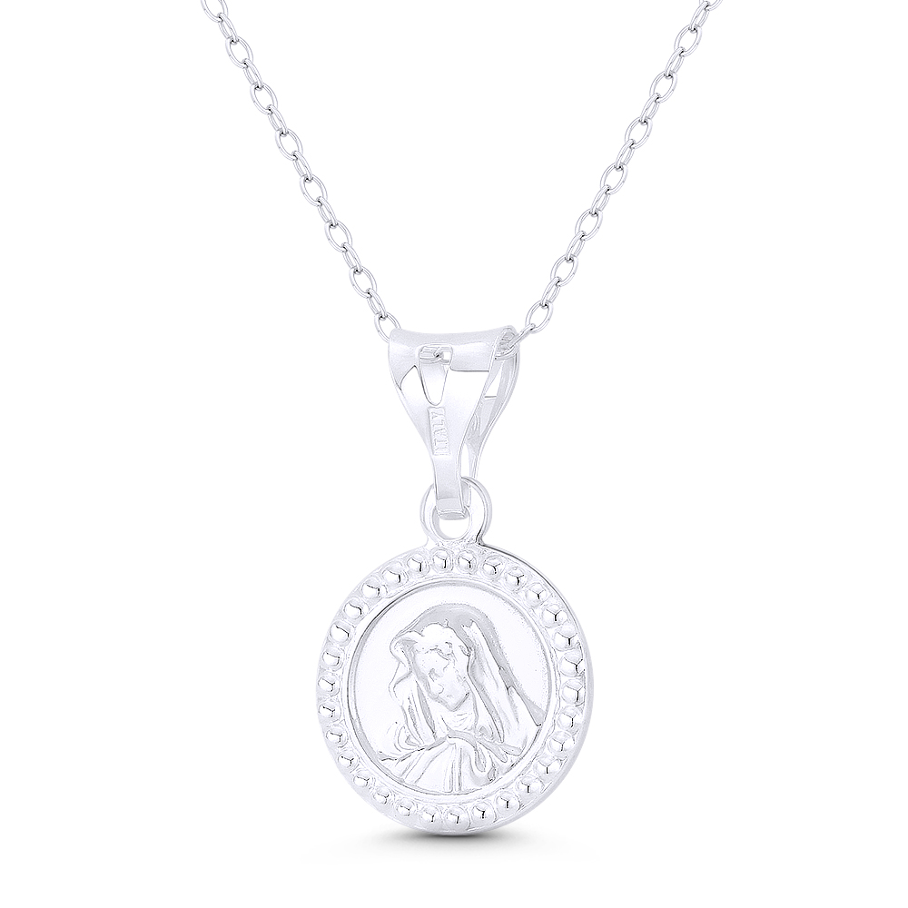 The featured Italian-made pendant is cast in lightweight .925 sterling silver and showcases a 15mm (0.6in) round button charm detailed with the image of the Holy Virgin Mary. The button charm is then finished with a sturdy bail that can accommodate most average-sized chains.