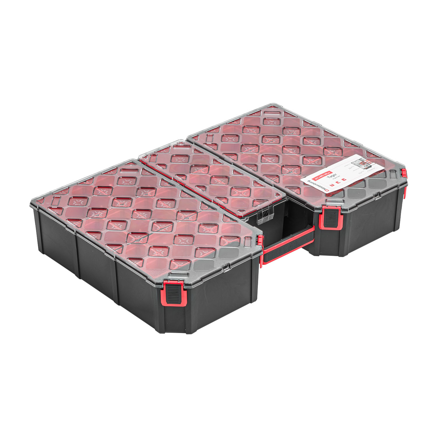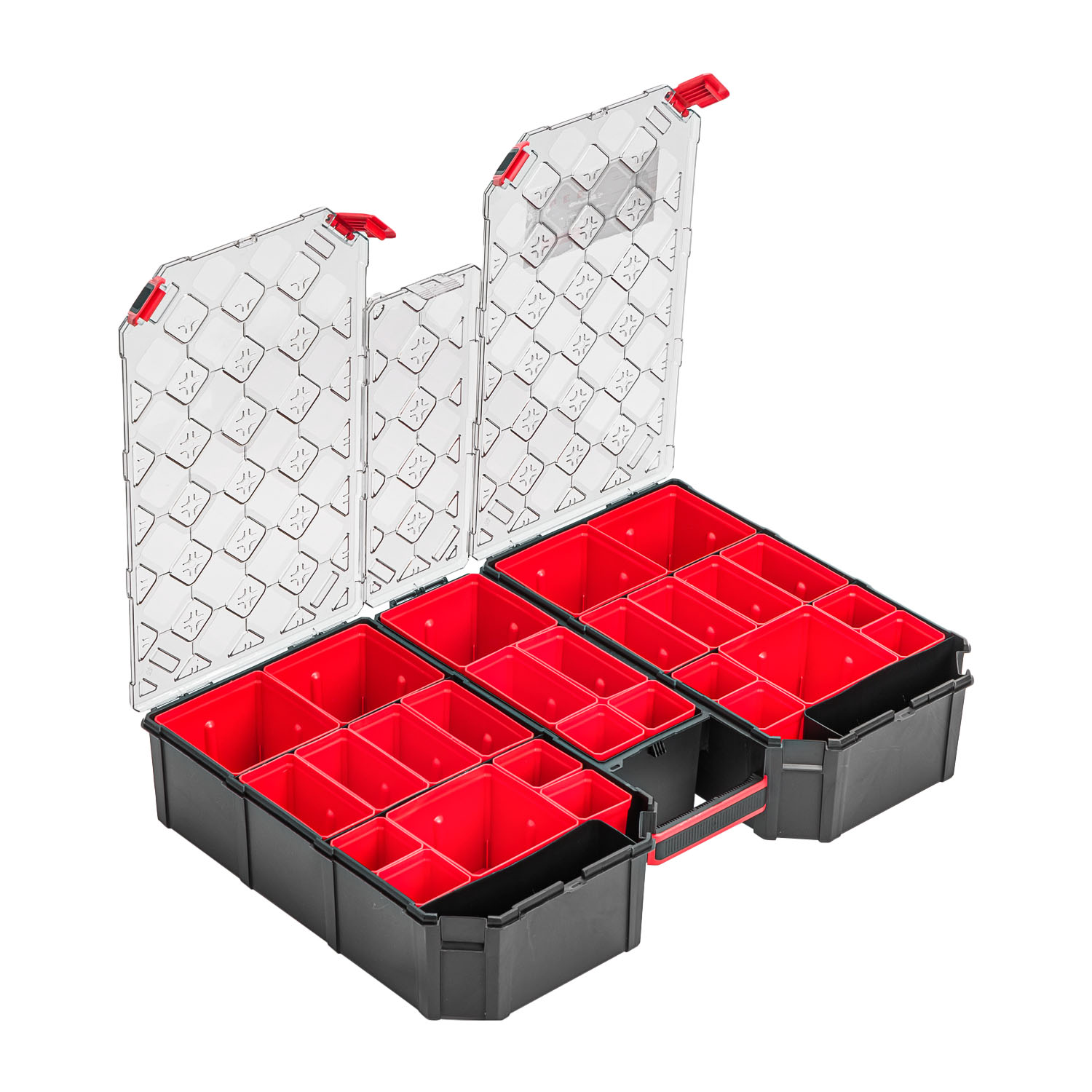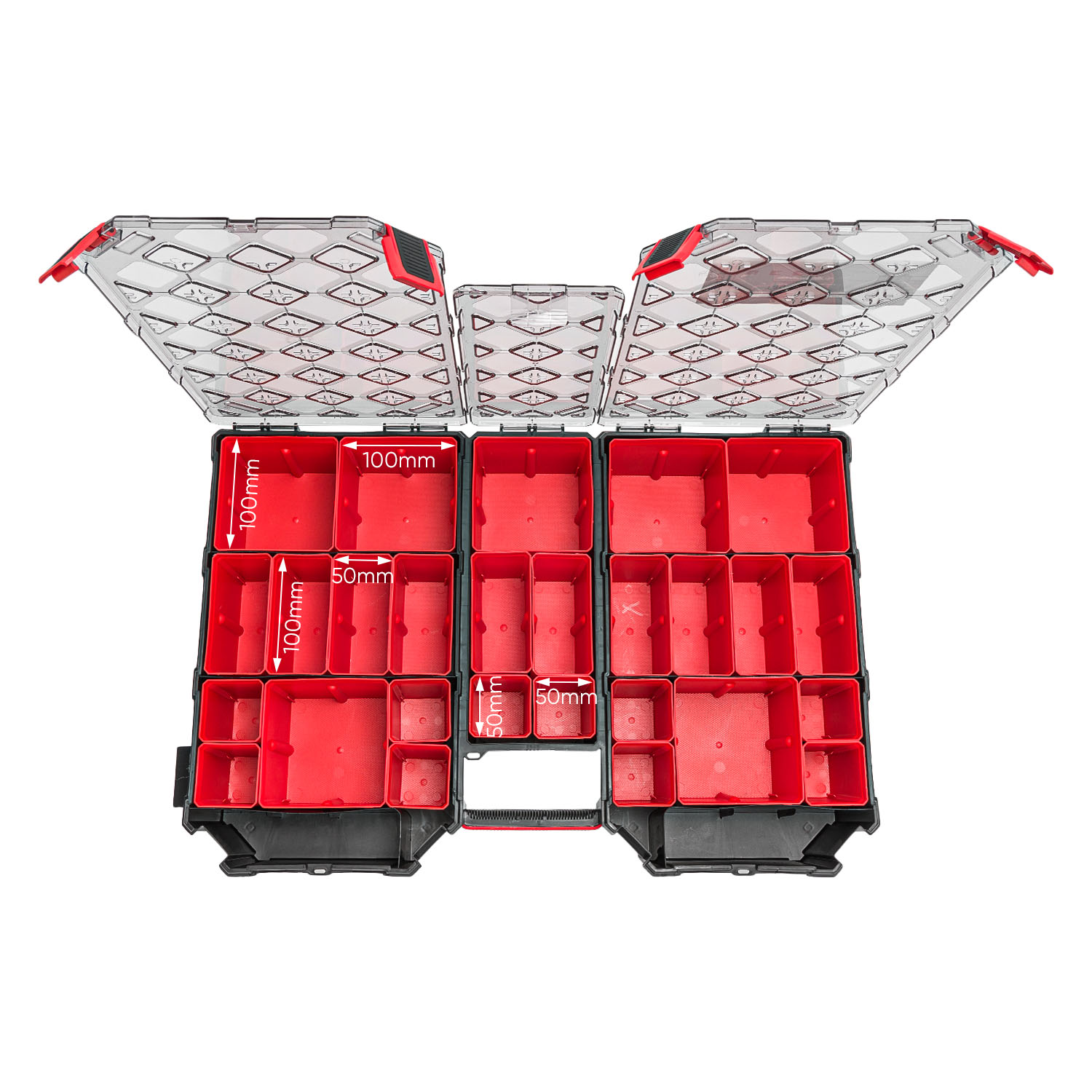 Ausgestattet mit starken Verschlüssen, die einen sicheren Transport gewährleisten und ein versehentliches Öffnen des Organizers verhindern.