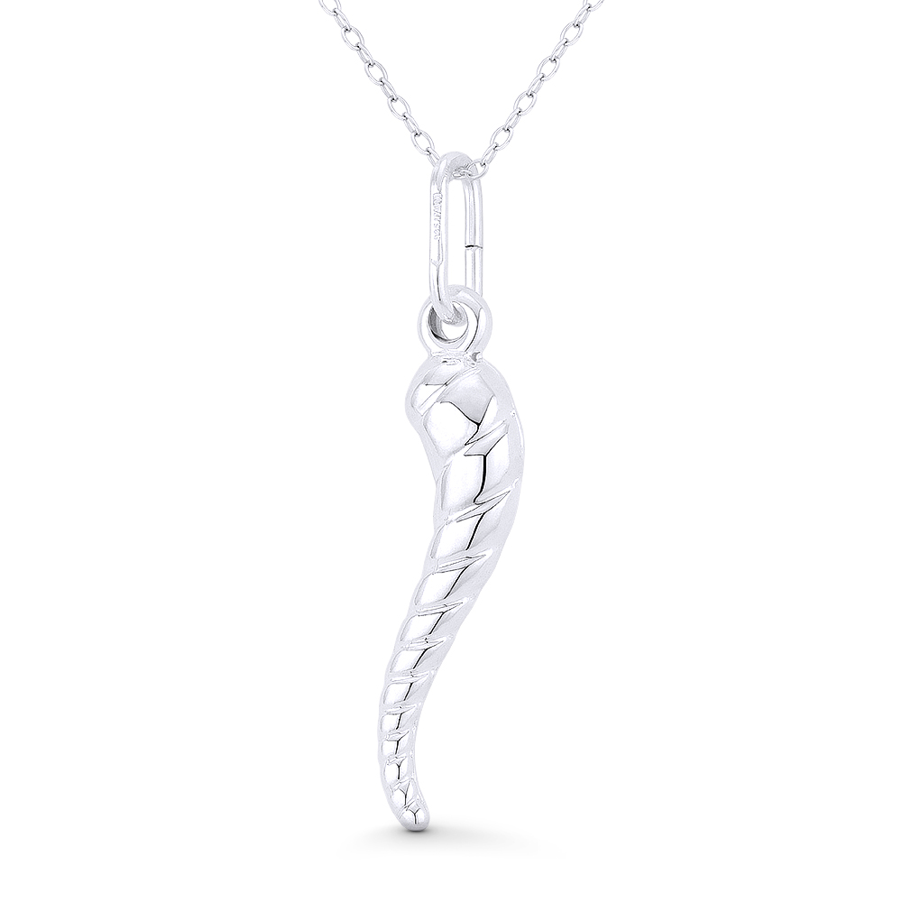The featured Italian-made pendant is cast in .925 sterling silver and showcases an Italian horn finished with a sturdy bail that can accommodate most chain sizes.