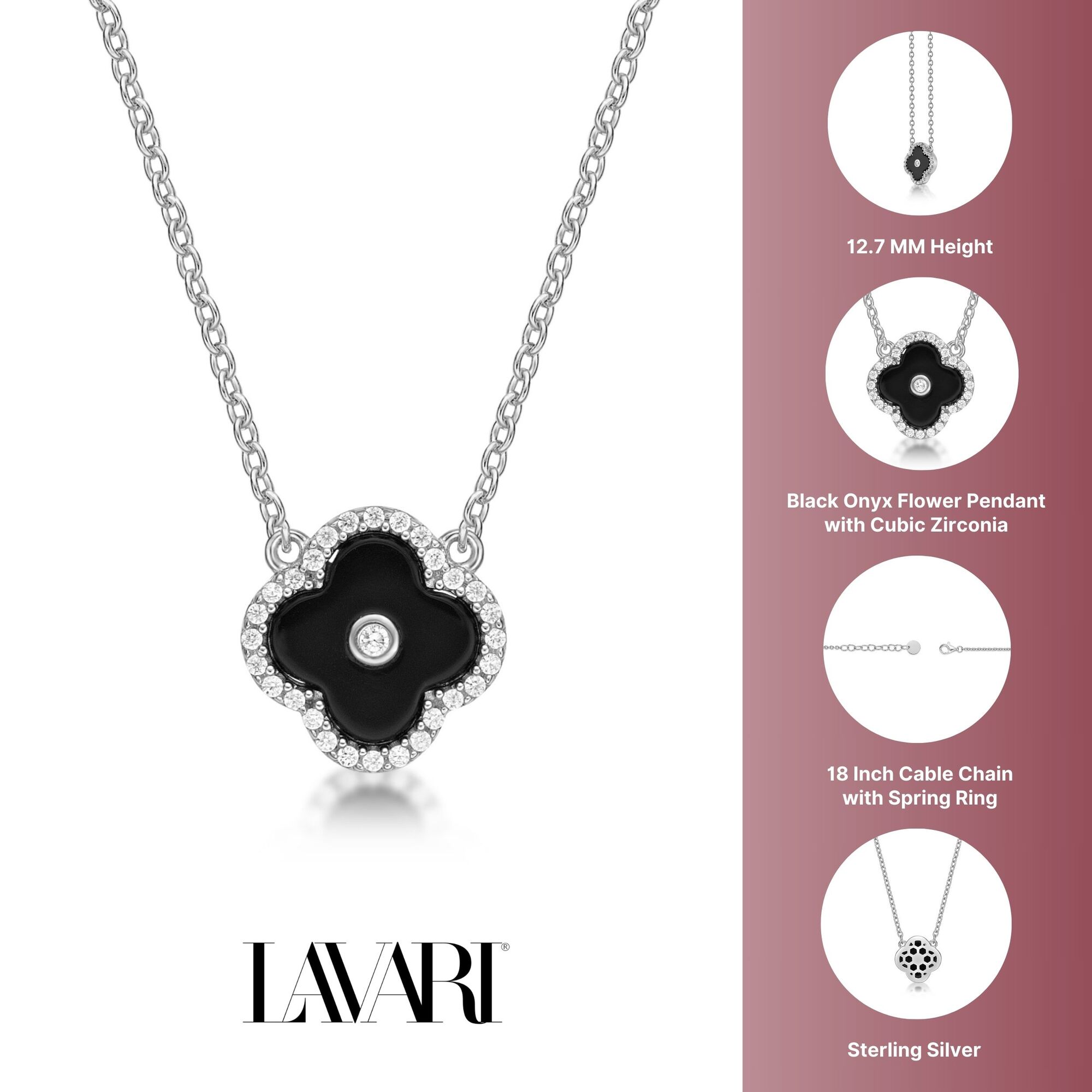 Constructed with a delicate cable chain, this necklace is expertly crafted in 925 sterling silver. It's not only stunning to look at, but also durable and long-lasting. The black onyx centerpiece exhibits a timeless allure that will add a touch of mystique to your ensemble. Additionally, the cubic zirconia halo surrounding the onyx adds a subtle sparkle that will catch the light and draw attention to your neckline.