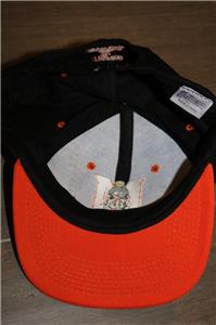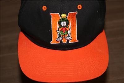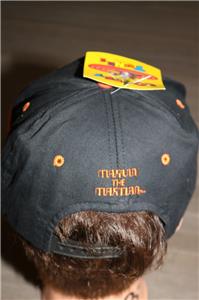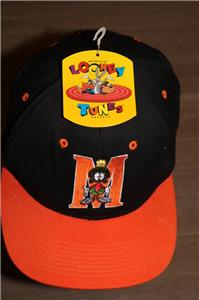 BLACK UPPER SURFACE AND ORANGE BILL / 100% COTTON MATERIAL / STITCHED FRONT "M" AND MARVIN THE MARTIAN CHARACTER AND STITCHED BACK LETTERING ON THE HAT / ADJUSTABLE SNAP STRAPS