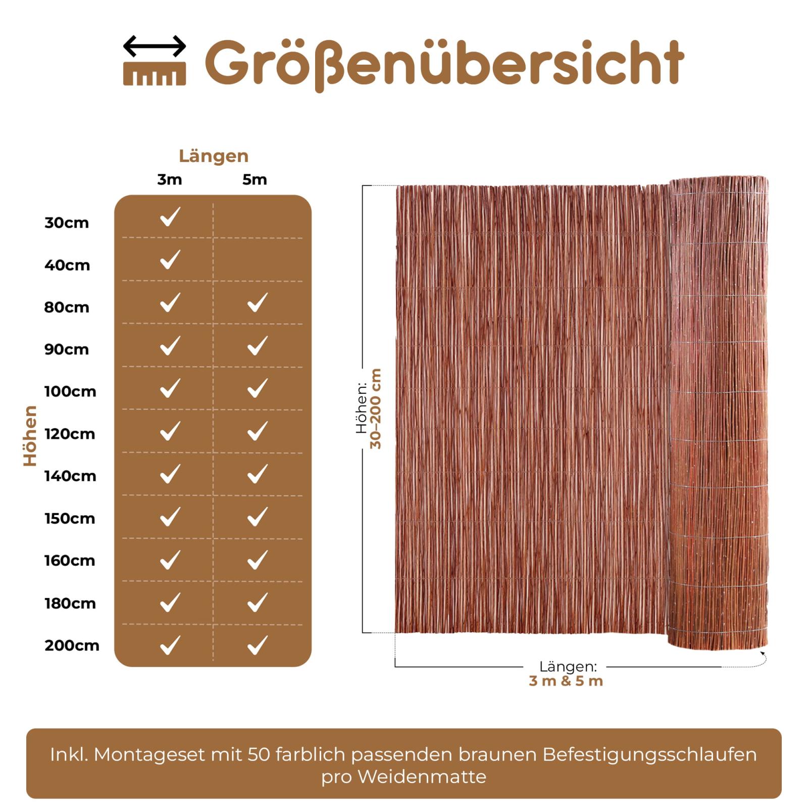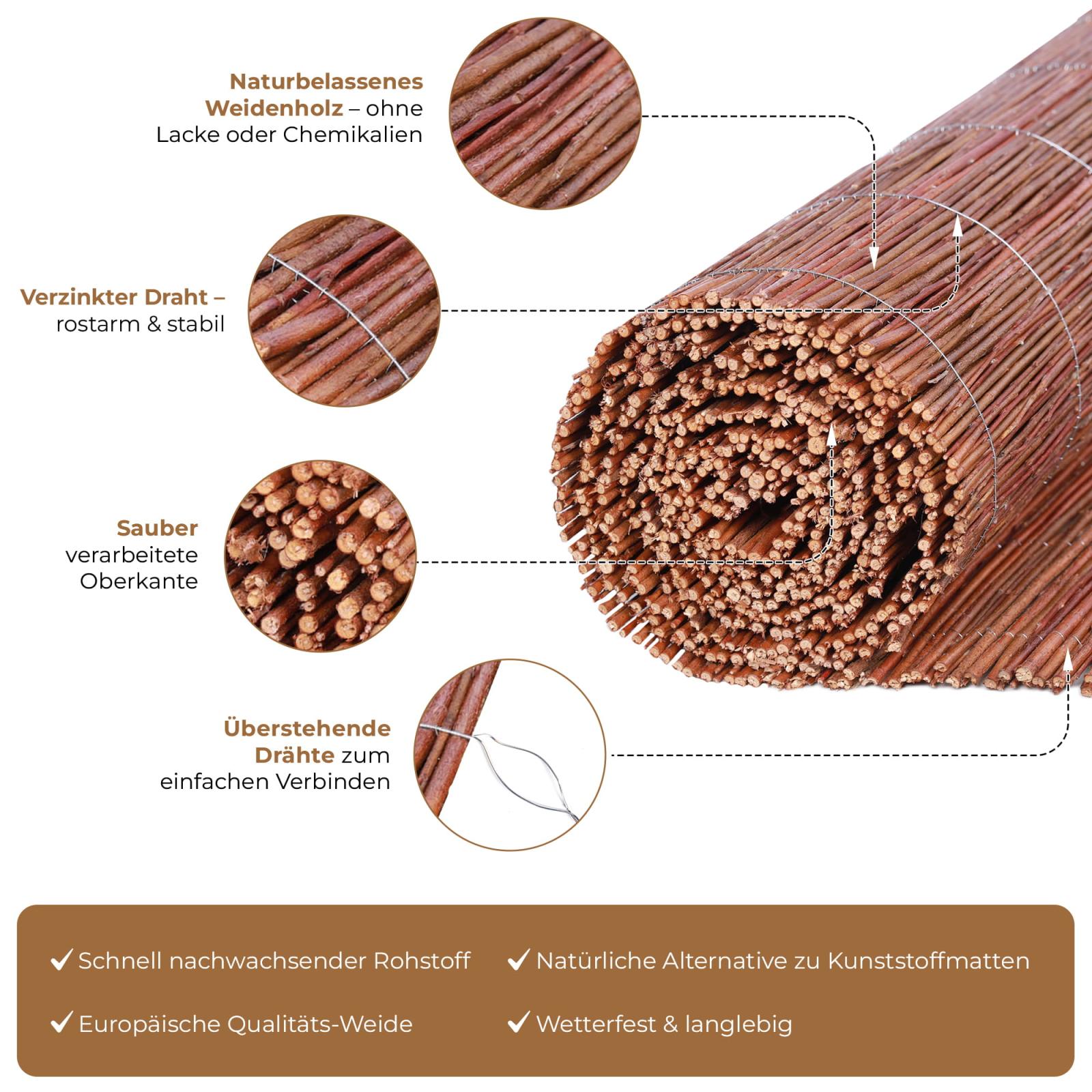 Unsere Weidenmatte ist ein vielseitig verwendbares Naturprodukt. Es handelt sich um ein EU-Qualitätsprodukt, welches mit professionellen Maschinen hergestellt wurde. Durch diese besondere Fertigung entsteht eine extrem hohe Beständigkeit, weswegen dieser Weidenzaun vor Wind, Staub, Lärm oder Licht schützen kann. Sie erhalten die Matte in 9 verschiedenen Höhen und in den Längen 300 bzw. 500 cm.