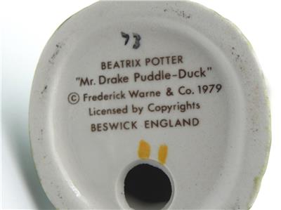 On offer is this delightful BEATRIX POTTER figurine by BESWICK - ENGLAND – Made in England titled **MR DRAKE PUDDLE-DUCK** and with the BP3c back stamp dating this figurine between 1985-1988. This being one of the rarer back stamps as it was not used on all models in the range.