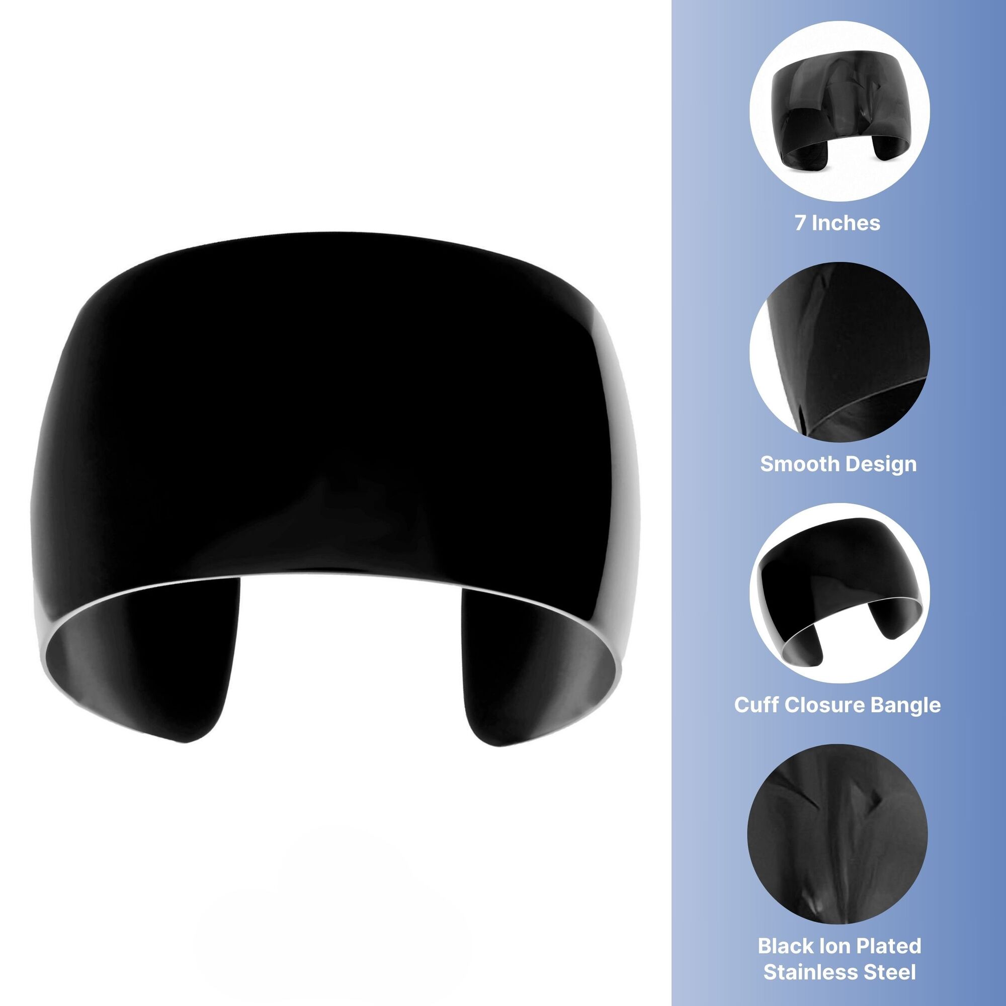Elevate your style game and add a touch of sophistication to your ensemble with our Women's Black Ion Plated Stainless Steel Smooth Cuff Bangle Bracelet. Whether you are treating yourself or looking for the perfect gift for a special woman in your life, this cuff bangle is the ideal choice. Don't miss out on the opportunity to own this must-have accessory - buy now and make a bold statement with every wear!