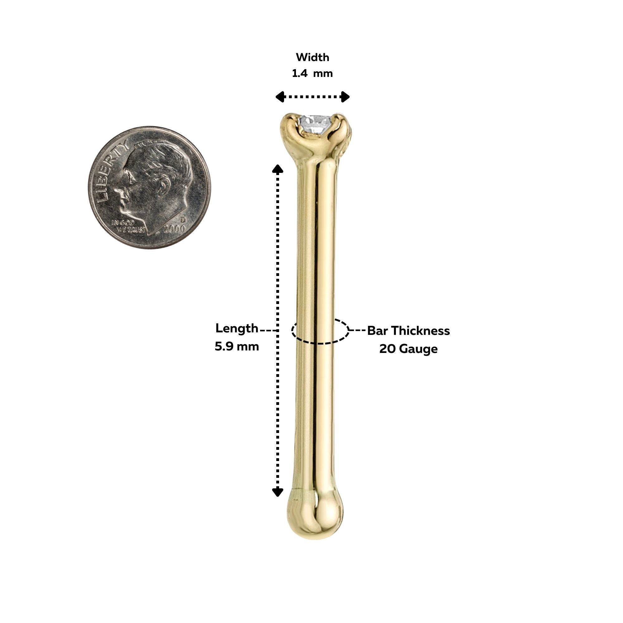 This nose ring features a stunning Lab Grown Diamond stone and it is crafted in a 20 g (0.8 mm) size and comes with a Straight post made from Yellow Gold. For care, simply To keep your lab grown diamond and yellow gold jewelry looking its best, avoid exposure to harsh chemicals, perfumes, and cosmetics. Store in a dry, cool place and clean with a soft cloth. For more thorough cleaning, use a gentle jewelry cleaner and avoid excessive rubbing or scratching..