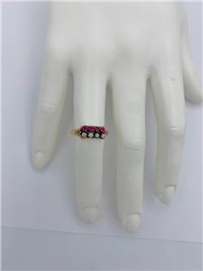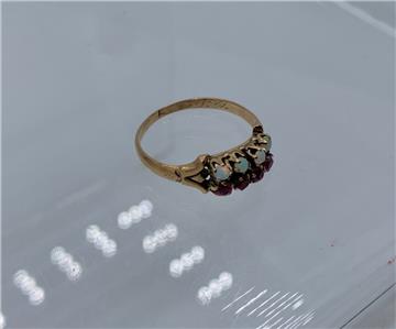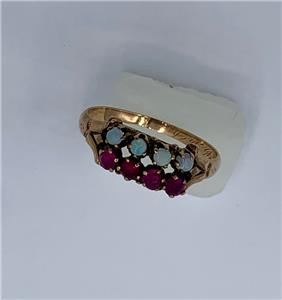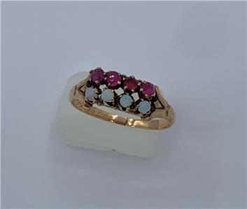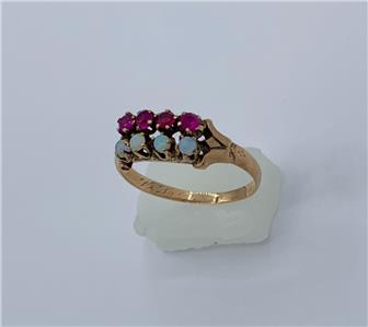 This is an Antique Victorian - Edwardian Ring with four gorgeous natural round Opals of stunning beauty. The four Opal gems are set with 4 round faceted Rubies! What a gorgeous and rare combination of gems. The opals have blue, green and yellow fire. The jewels are set in a wonderful detailed setting in 10 Karat Rose Gold. The interior of the band has lovely early engraved initials.