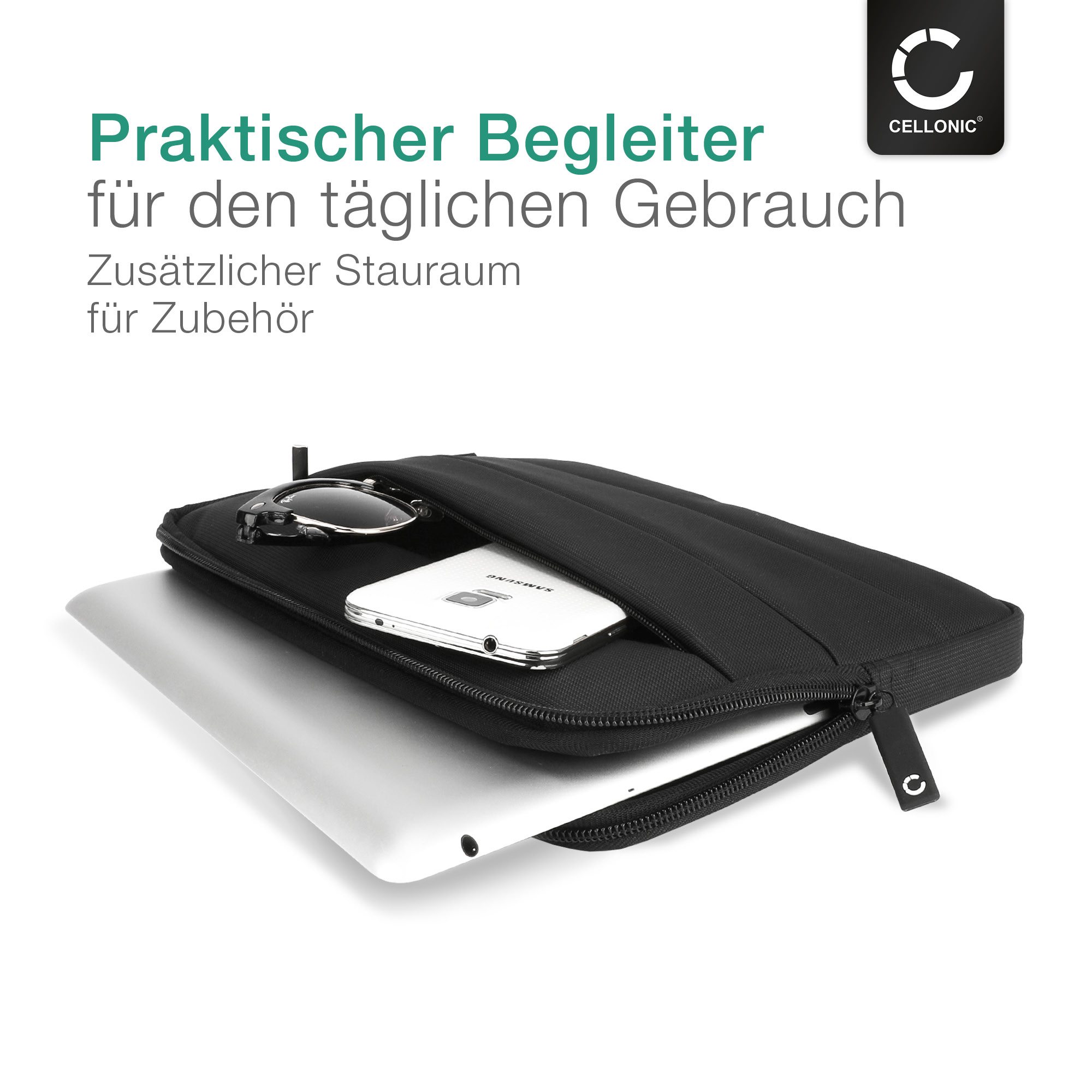 Als Verschluss der Tragetasche dient der robuste Reißverschluss mit Soft Zippern im eleganten CELLONIC®-Design.