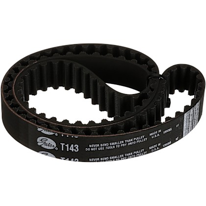 GATES CAMSHAFT TIMING BELT, BLACK -- 0.38 in. pitch, 39.75 in. pitch length, 0.95 in. top width, 106 modified curvilinear III teeth; Made from highly saturated nitrile; Features high tensile strength cord construction that minimizes stretch; Aramid reinforced nylon jackets and backside jackets for longer wear; Tough and wear-resistant fabric resists oil and engine heat; With lifetime Gates limited warranty.