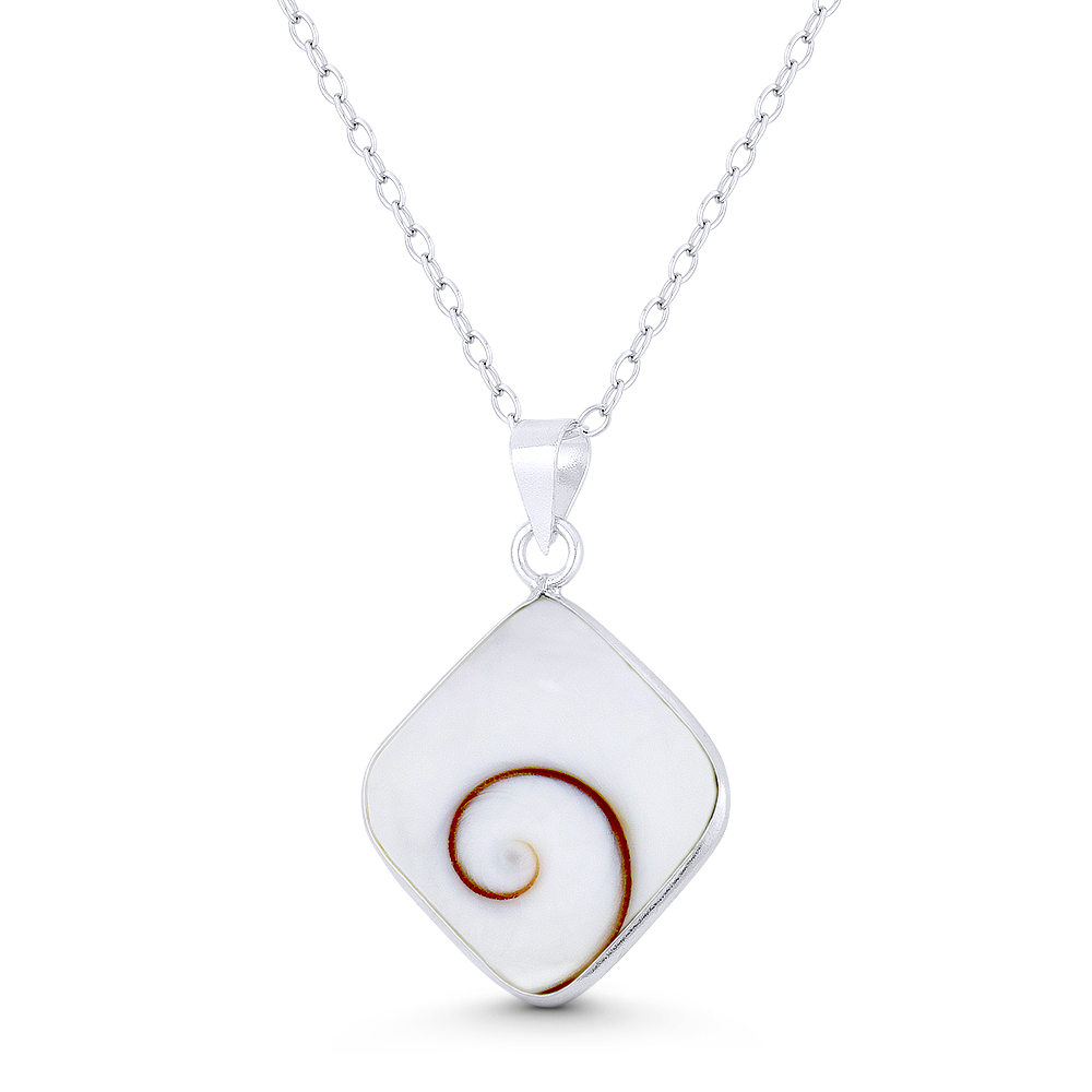 The featured pendant is cast in .925 sterling silver and showcases a rhombus half-sphere faux seashell enamel held by a thin frame finished with a sturdy bail that can accommodate most chain sizes.