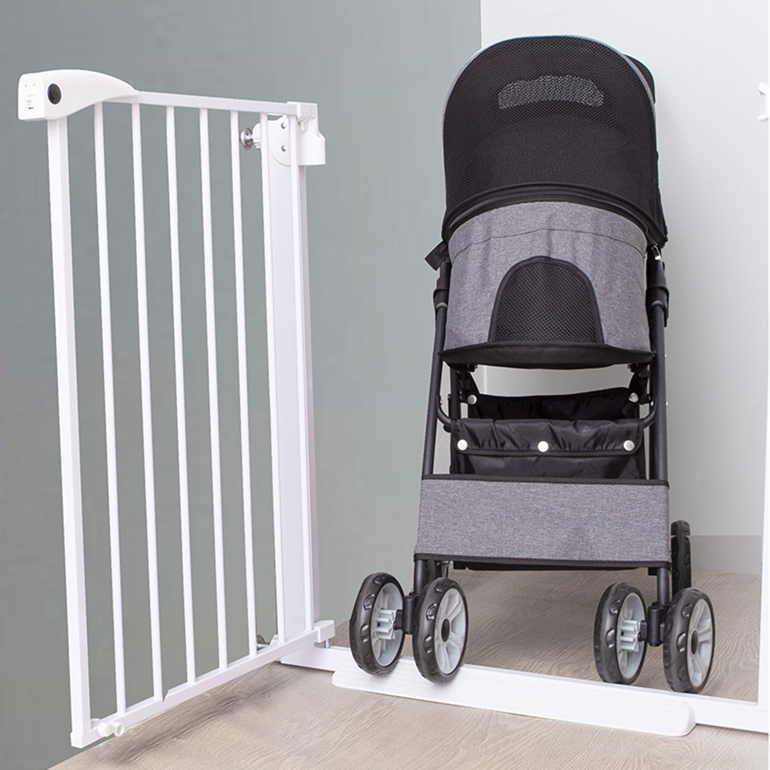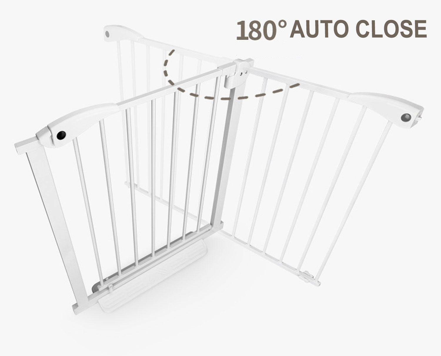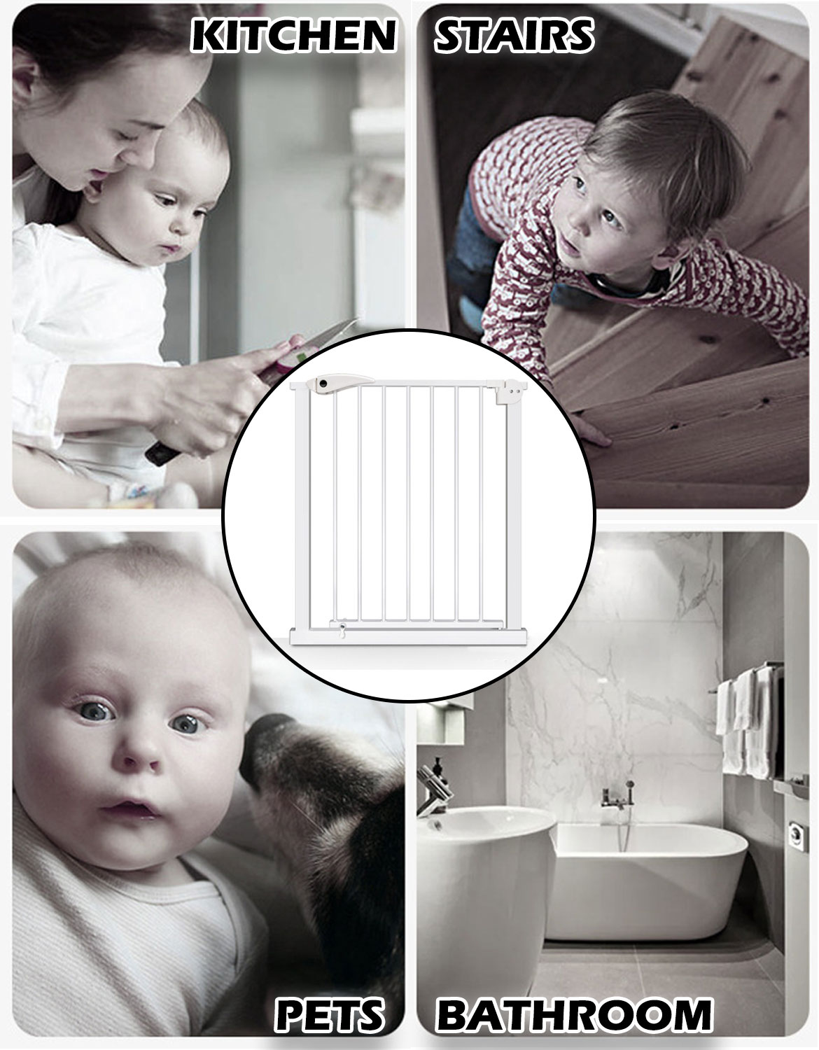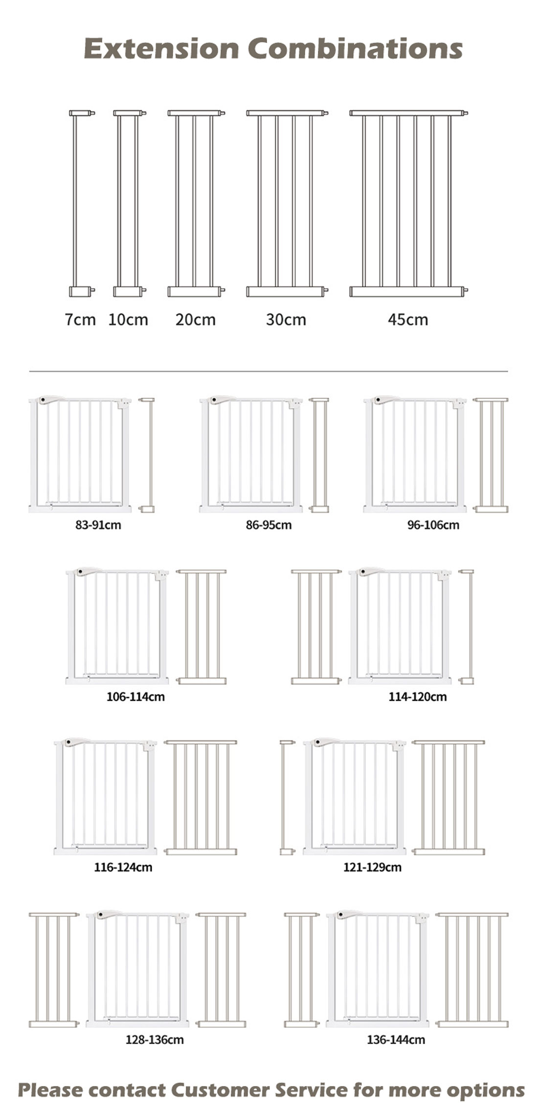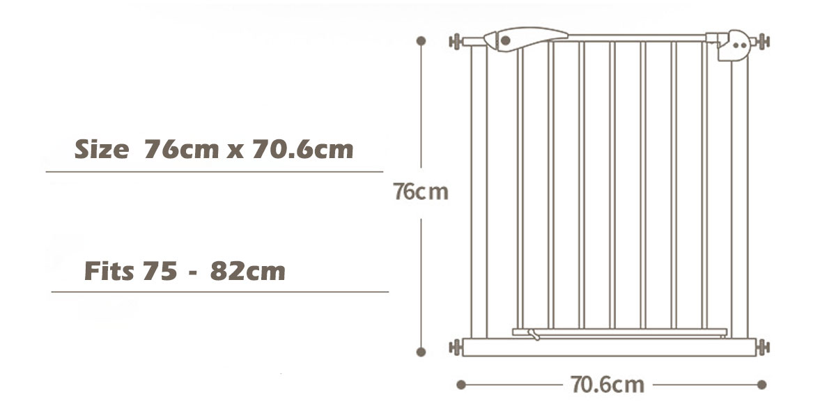 Child Pet Safety Gates Adjustable Baby Gate will be a competent helper to prevent your kids and pets from danger when you are cooking, reading or doing housework. Featuring 76cm height and 75cm to 82cm width, with optional extensions in different sizes (7cm, 10cm, 20cm, 30cm, 45cm,80cm), this child safety gates can be set up with ease in the dining room, stairs or aisles etc. With the automatic opening and closing system, this baby gate allows you to operate easily in or out of the door but not your little ones. Equipped with 2 step pass, the wide baby gate allows you can come in and go out much more conveniently and safely. Build in durable and sturdy metal material, the gate adds another level of protection. What are you waiting for? The kids safety gates are doomed to be your decent selection