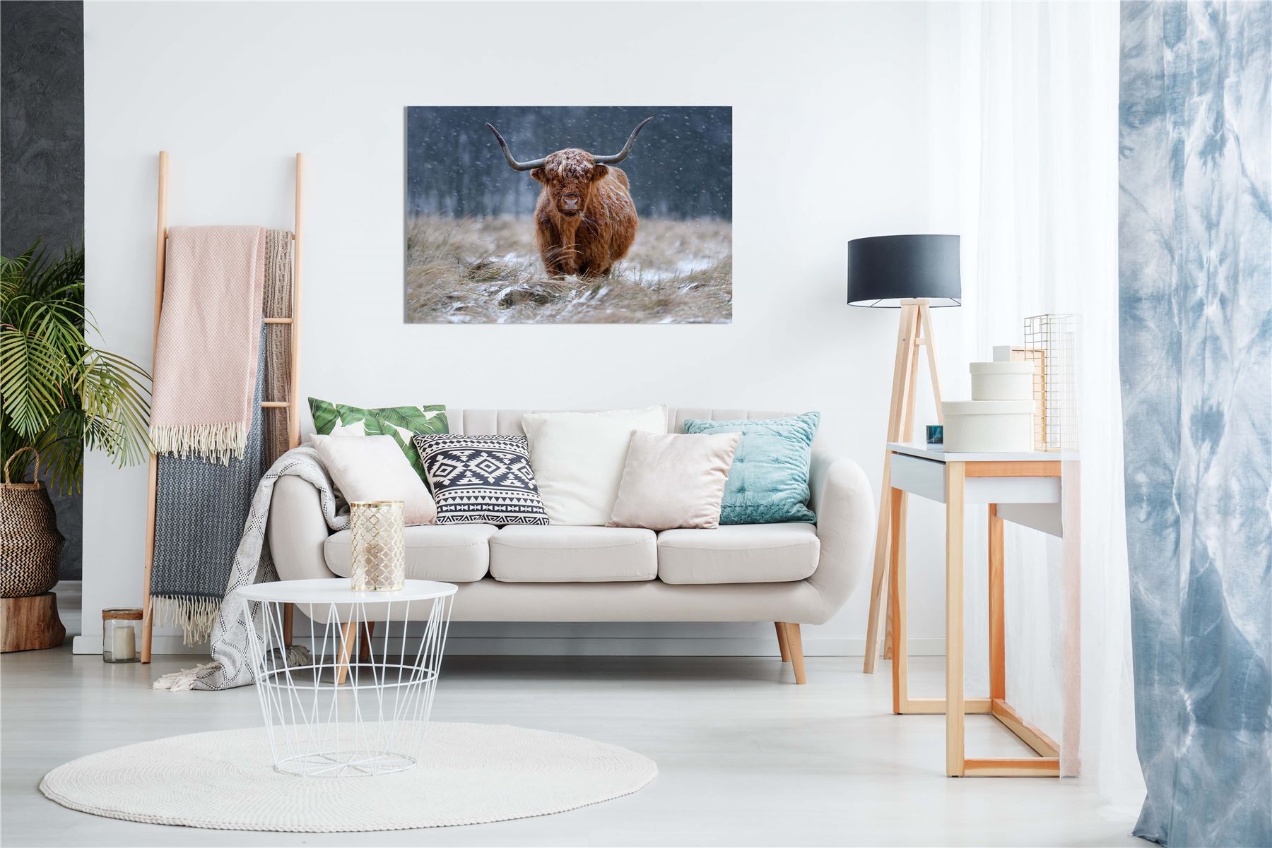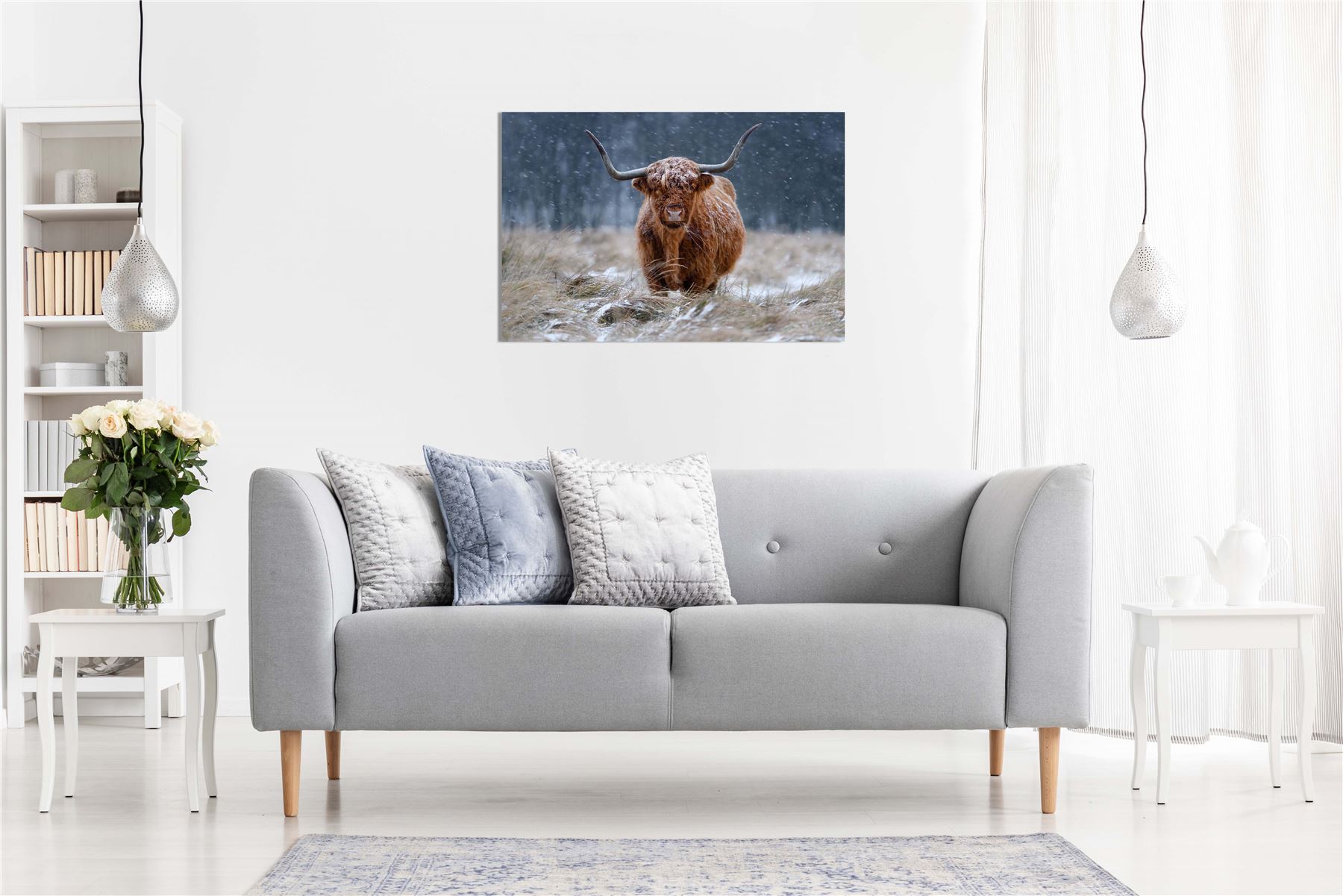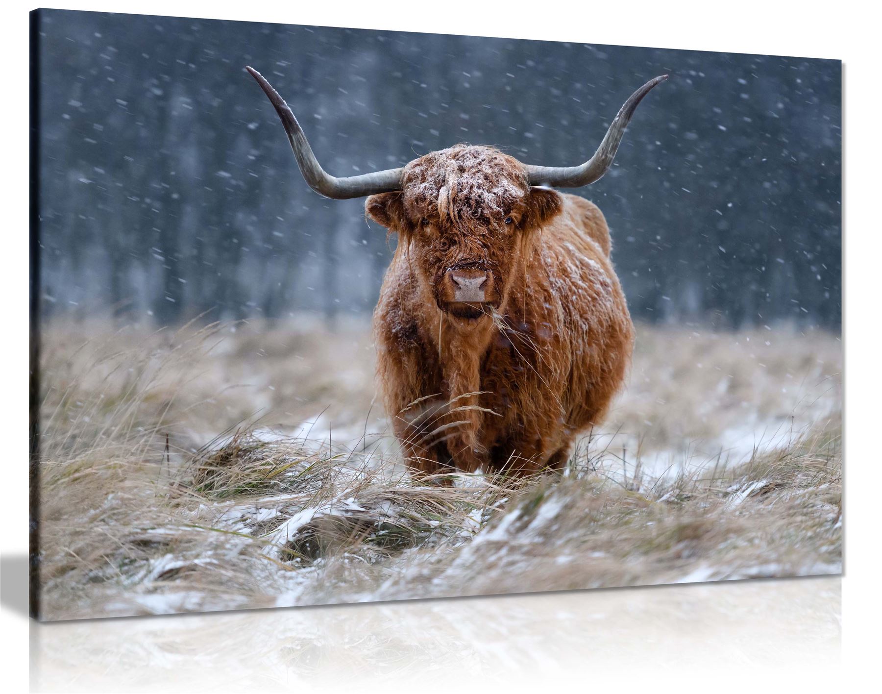Brown Highland Cow in Snow Fields Framed Canvas Print Wall Art Home Decor