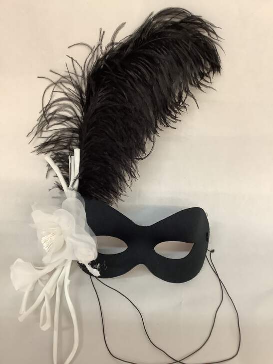 Make an elegant statement in this simple black fabric mask with white blossom and plume extending 9" on the right side.