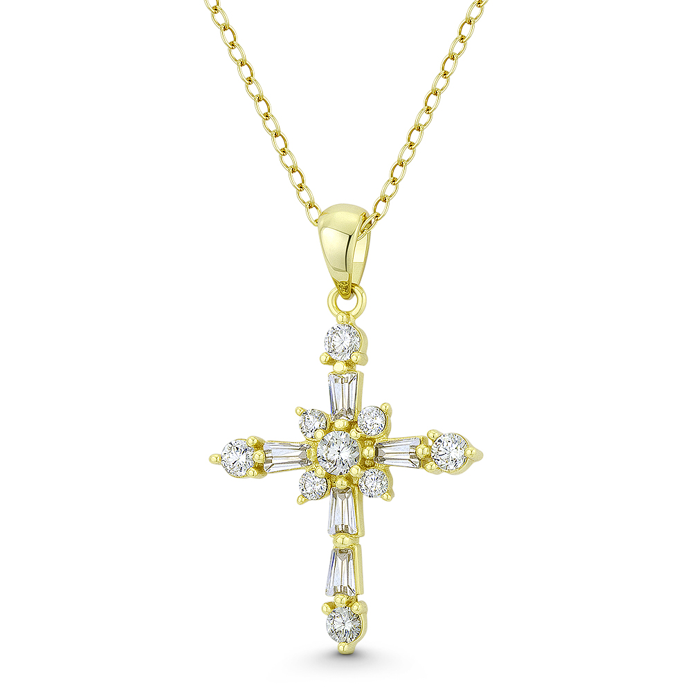 The featured pendant is cast in 14k yellow gold-plated .925 sterling silver and showcases a Rosicrucian cross design adorned w/ round & tapered baguette cut cubic zirconia crystals. The cross is then finished with a sturdy bail that will accommodate most chain sizes.