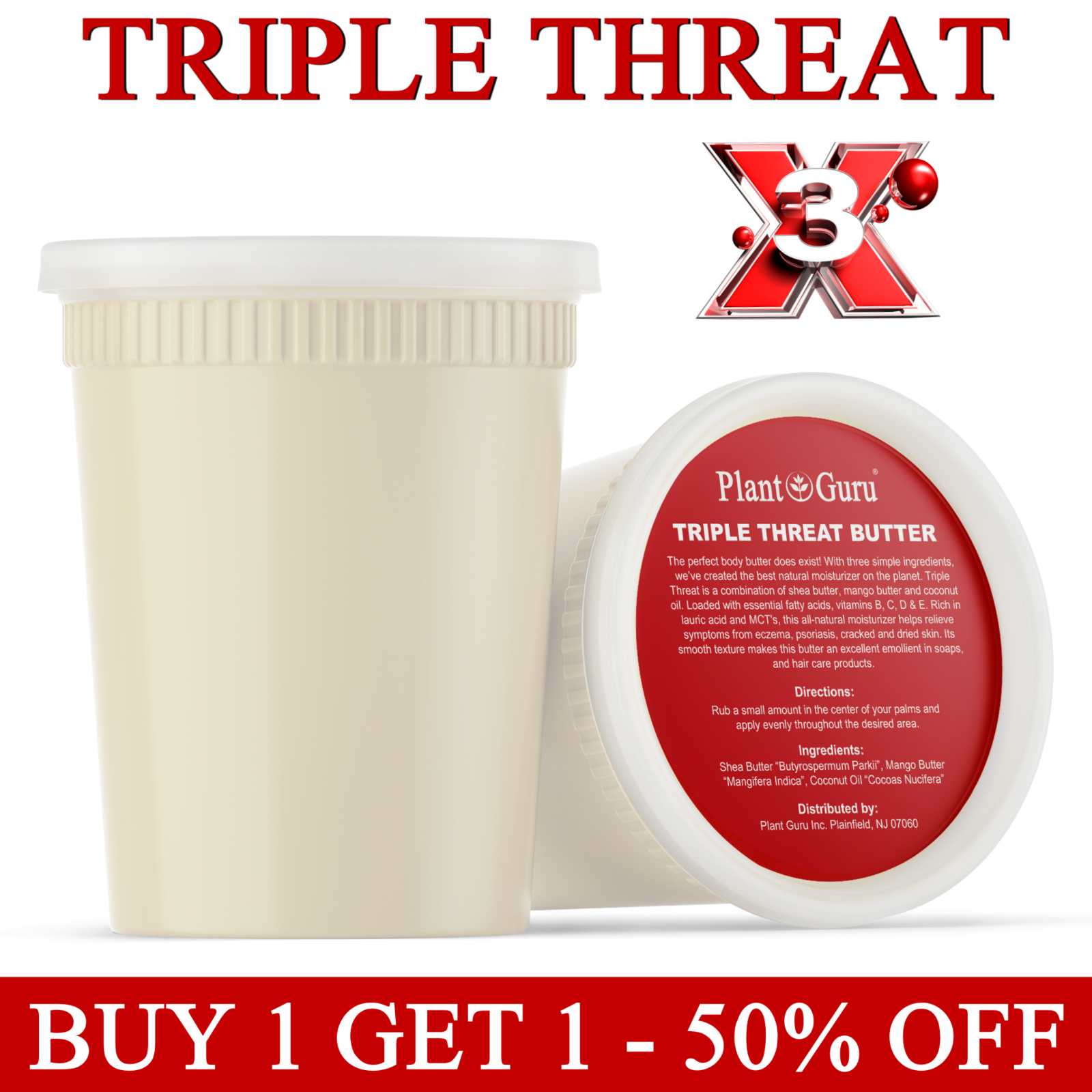 The perfect body butter does exist! With three simple ingredients, we’ve created the best natural moisturizer on the planet. Triple Threat is a combination of unrefined shea butter, unrefined mango butter and extra virgin coconut oil. Loaded with essential fatty acids, vitamins B, C, D & E. Rich in lauric acid and MCT's, this all-natural moisturizer helps relieve symptoms from eczema, psoriasis, cracked and dried skin. Its smooth texture makes this butter an excellent emollient in soaps, and hair care products.
