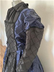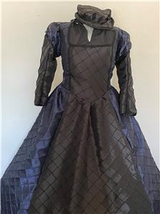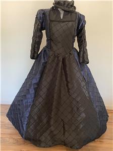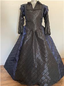 This auction is for a one piece Renaissance, Elizabethan, Shakespearean, Romeo & Juliet or Tudor dress/gown, your size choice of busts 32" - 46". The side dress and bodice is made of navy blue pintuck taffeta and the reminader is made of black pintuck taffeta. It has small puffy upper sleeves and a lower straight sleeve that conforms to the elbow. There is black trim around the neckline, down the front bodice, on the upper sleeves and lower sleeve wrists. The flat hat is made of black pintuck taffeta with a small brim and trim between the brim and hat. And the bodice and upper sleeves are fully lined, and the dress laces down the back with grommets and has a modesty panel. There is also stiff interfacing in the front bodice. Upon the auction's end I will email the winning bidder requesting required measurements of bust, waist, biceps, front and back shoulder seams to waist, waist to floor and height. Also please allow 2 to 3 weeks for completion once measurements have been received. Also, the dress is displayed with a parlet and over a 5-bone hoop which are not included in the auction, but the partlet can be purchased separately. Gowns are non-returnable and non-refundable, so please double check all your measurements, ask questions and bid with confidence. Thanks for looking and feel free to e-mail me with any questions or additional measurements.