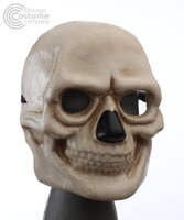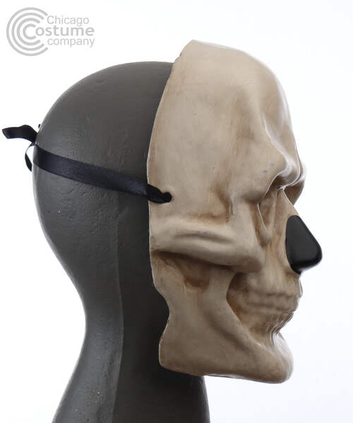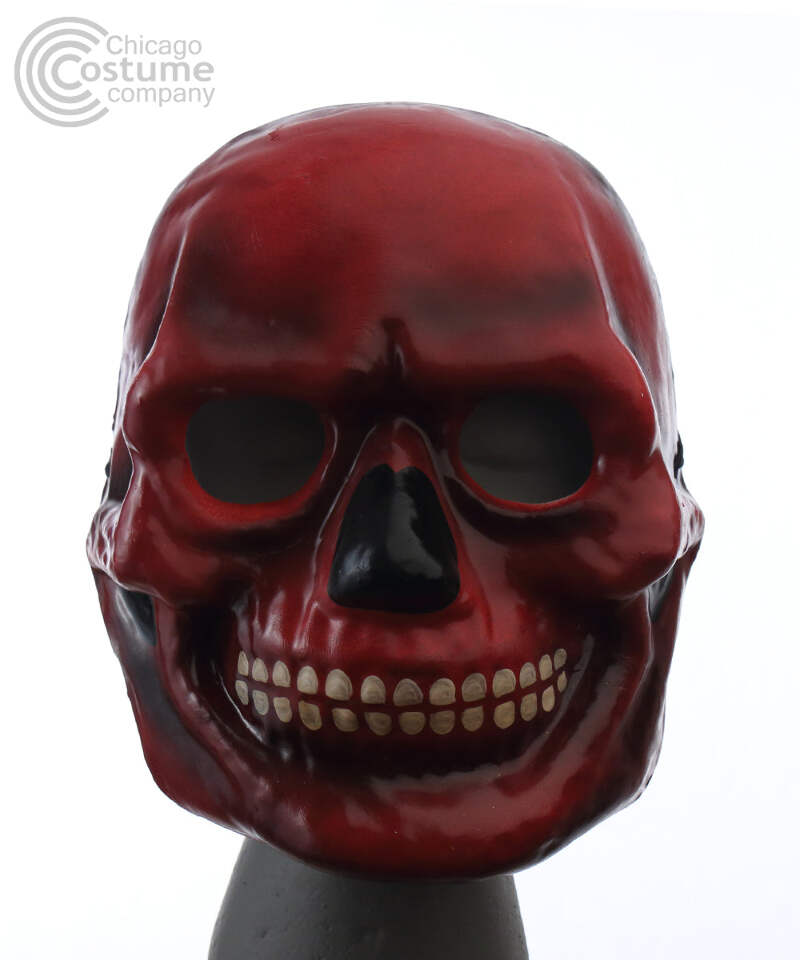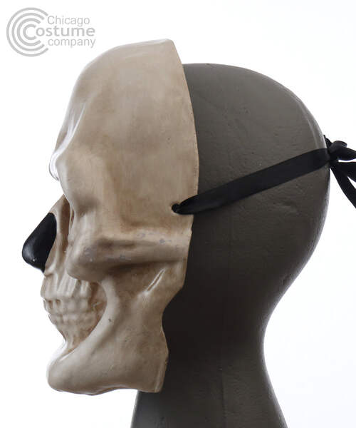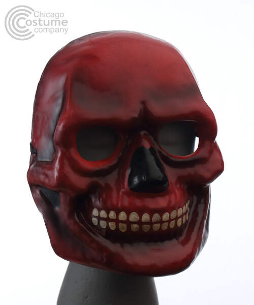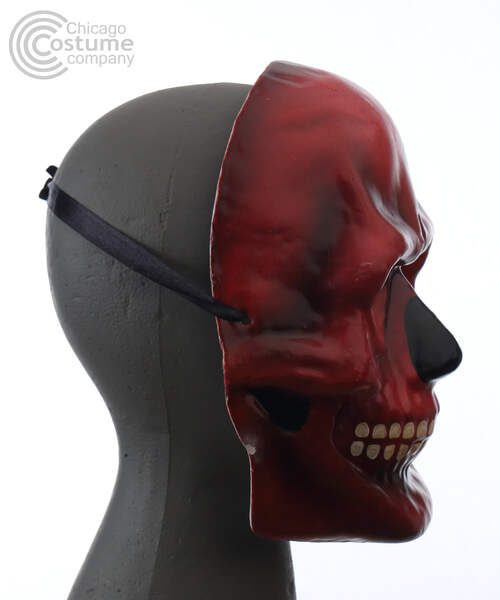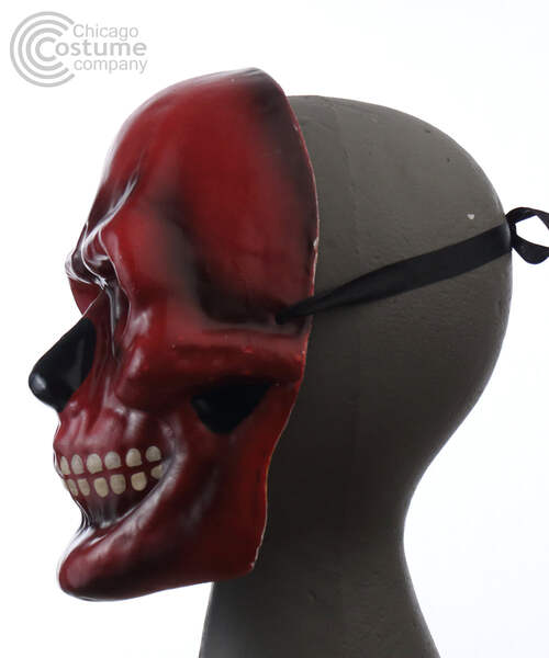 Spook up any masquerade party with this full face skull mask in bone white or blood red. Secures with ribbon ties. One size fits most.