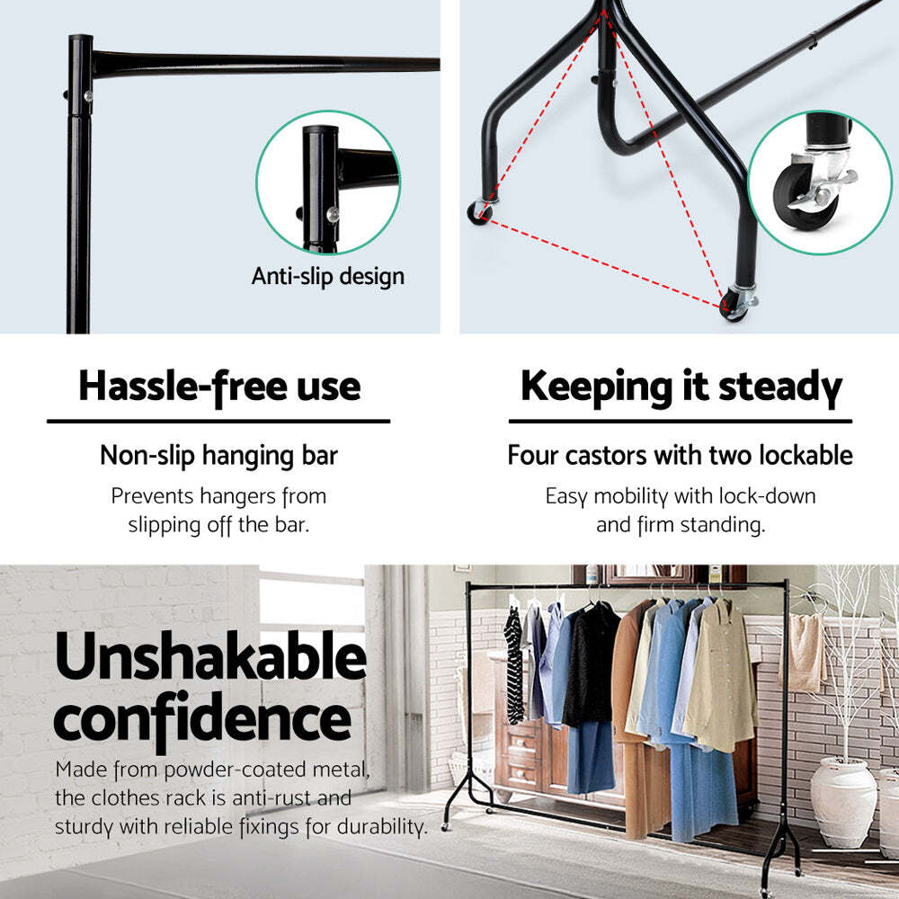 Simple and yet extremely practical. Our black metal clothes rack adds a stylish presence to your bedroom and wardrobe. Better still, its powder-coated steel structure is sturdy and strong with reliable fixings to keep it in shape at all times. With up to 60kg maximum capacity, this clothes rack is no pushover when it comes to hanging all sorts of apparels. And its anti-slip design adds a considerate touch to prevent hangers from slipping off the hanging bar. Not least, its four castors with two that are lockable means that you have this rack anywhere in your home, shop or studio with minimum fuss.