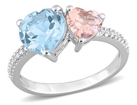 Add a cute and adorable accessory to your collection with this flattering Toi et Moi Ring. Crafted in lustrous sterling silver, this gorgeous ring showcases one heart-cut prong-set sky blue topaz, one heart-cut prong-set morganite gemstone, and 16 round, buttercup-set diamonds (H-I-J, I3) studded along the edges of the sleek band. Enhanced with a polished finish, this toi et moi style ring is ideal for layering.