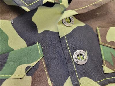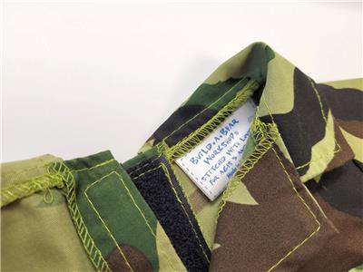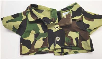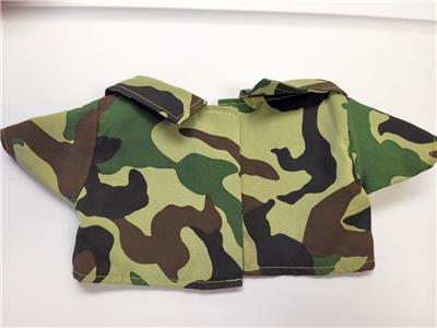 Camo shirt : Pointed Collar, Short Sleeves and Two Pockets (real and not just sewn to look like pockets). Front BAB buttons are for decoration. Back closes with hook and loop piece. Nice and Crispy Clean with No Tears. TAGGED with BAB tag. Measures from shoulder seam to bottom hem at 6.5". From side seam to side seam it measures to be 10" wide.