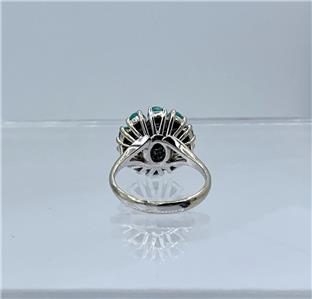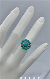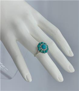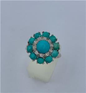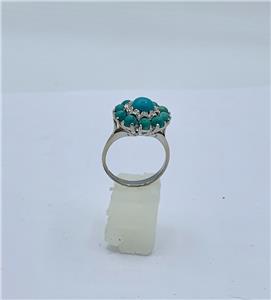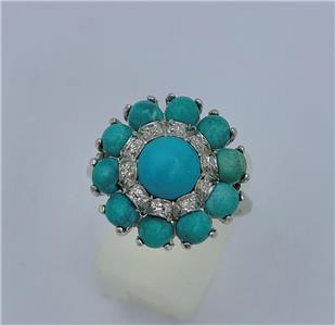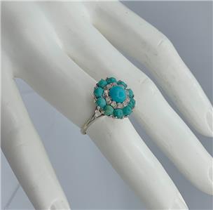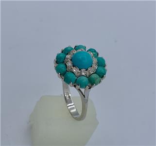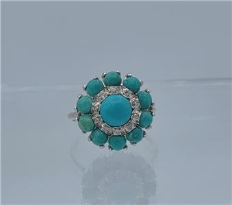 DescriptionThis is a gorgeous Antique Retro - Art Deco Ring with gorgeous natural Persian Turquoise cabochons of stunning beauty with a halo of 10 sparkling white Diamonds set in 18 Karat White Gold.