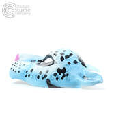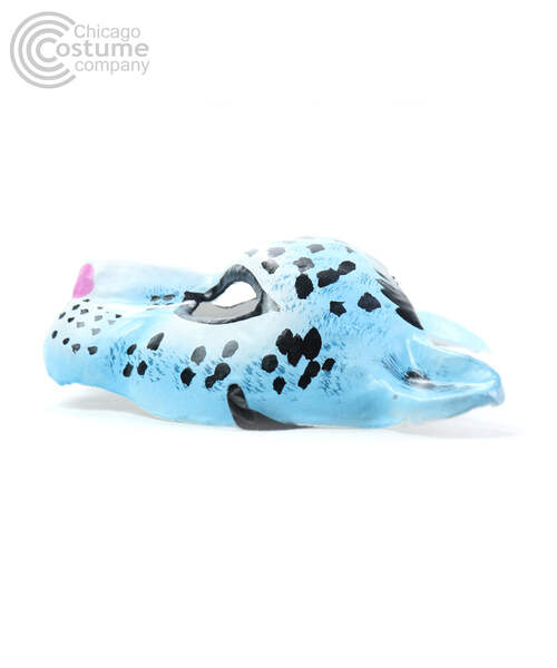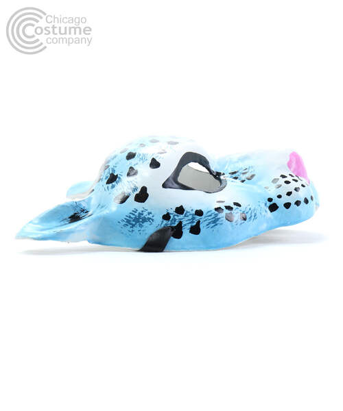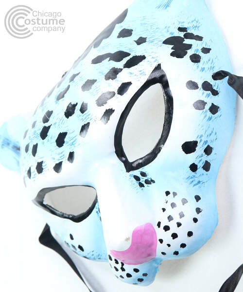 Paper mache half face mask with hand-painted light blue and white leopard design. Secures with two black ribbon ties. One Size fits most adults.