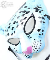 Paper mache half face mask with hand-painted light blue and white leopard design.