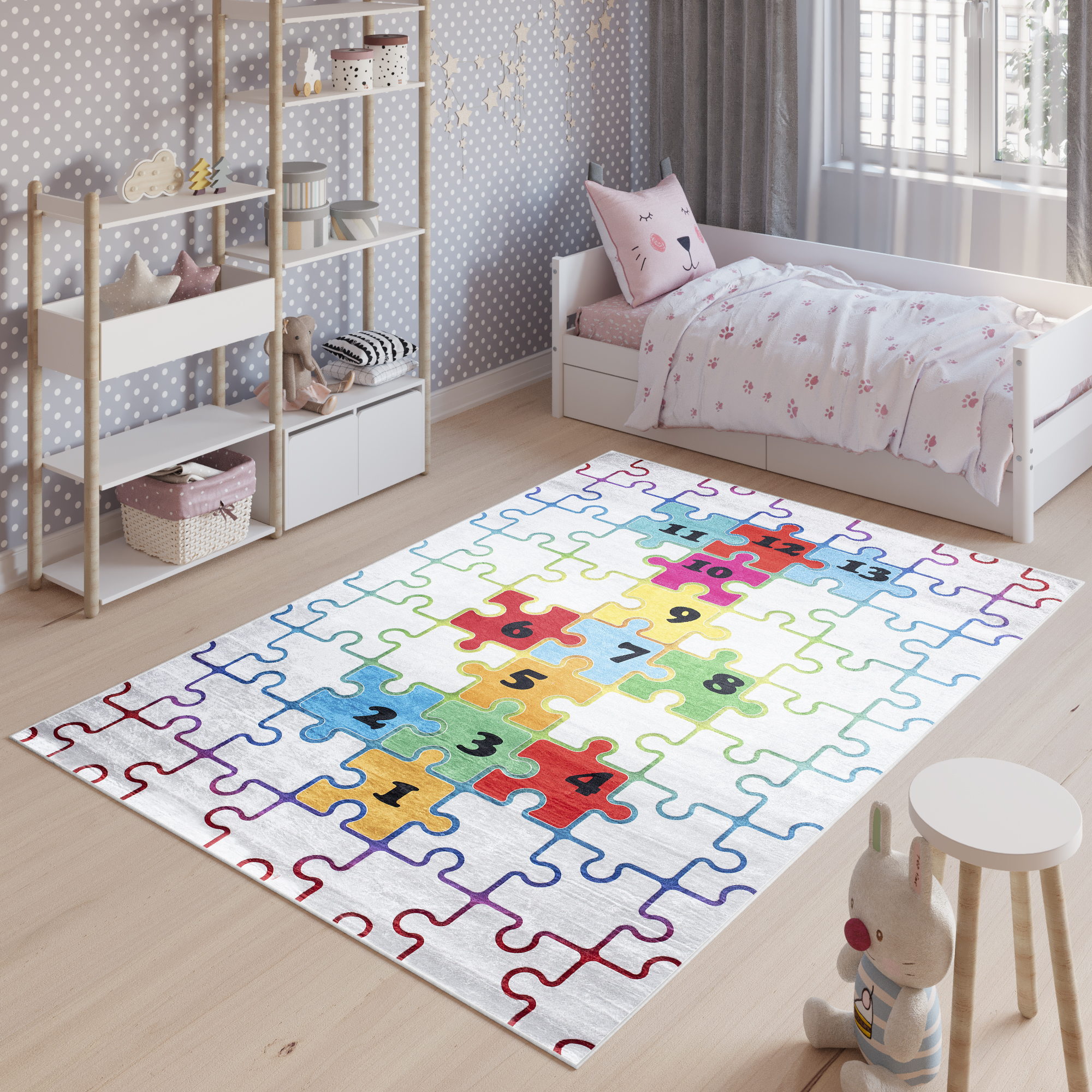 In einem Schlafzimmer ist der Teppich mit der Größe von 250x300 cm ideal für ein Doppelbett oder zwei Einzelbetten. Hingegen dazu eignet sich ein Teppich mit Ausmaß von 300x400 cm gut für ein Kingsize- oder Queen-Size-Bett. Designer Tipp: Der Teppich sieht am besten aus, wenn er senkrecht unter das Bett gelegt wird und auf beiden Seiten genügend Platz für Ihre Füße bietet.