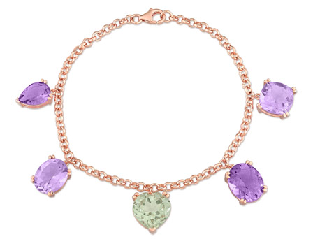 This vibrant multi-shape multi-color 5-stone station bracelet is crafted in lustrous rose-plated sterling silver and features one oval-cut, (11x9mm) and one cushion-cut, (10x10mm) prong-set pink amethyst, one oval-cut, (12x10mm) and one pear-cut, (10x7mm) prong-set amethyst (10x7mm), and one heart-cut, prong-set green quartz (amethyst) (11x11mm) gemstones suspended on the chain. Enhanced with a polished finish, this exquisite bracelet measures 7.25 inches in length and is secured with a lobster clasp. Wear this charming bracelet to your next casual outing.