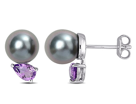 These radiant two-stone stud earrings are mounted in lustrous sterling silver. These captivating earrings feature two drop-shaped, black Tahitian cultured freshwater pearls and two pear-cut, prong-set African amethyst gemstones placed below the pearls. Polished to a brilliant shine, these enchanting earrings are comfortably secured with butterfly closures. Look flawless for a business party with these exceptional earrings.