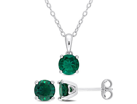 Show off your elegance with this classic solitaire pendant with chain and earrings. Crafted in lustrous sterling silver, this splendid two-piece set features three round-cut, 4-prong-set, created emerald (6x6mm) gemstones in a classic heart design on earrings and pendant settings. Enhanced with a polished finish, the exquisite pendant is suspended on an 18-inch round cable chain secured with a spring-ring clasp, and the matching solitaire earrings are secured with butterfly closures. A simple yet meaningful gift idea for a May-born diva.