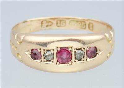 A fabulous antique Victorian 15k gold ruby and diamond five-stone ring, hallmarks for Chester 1892.