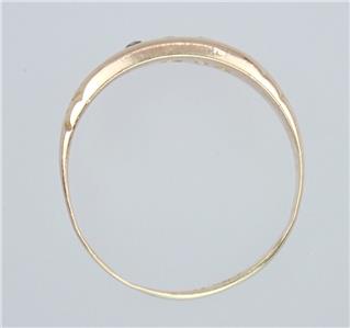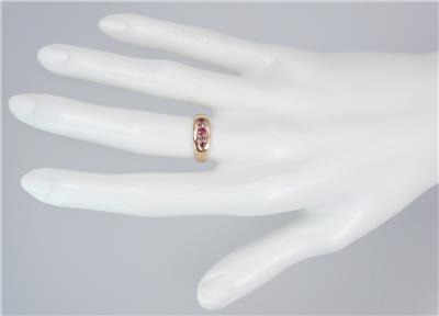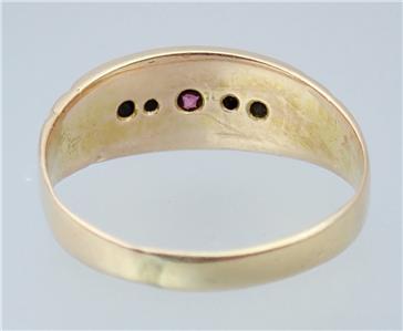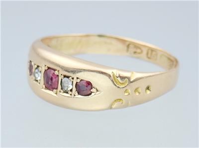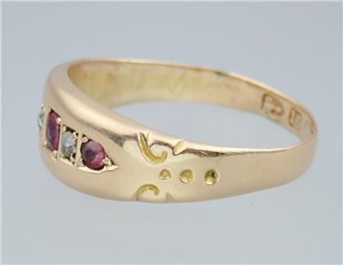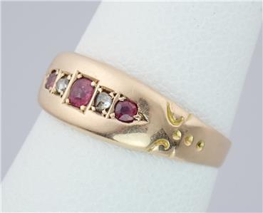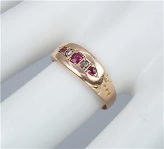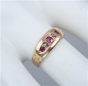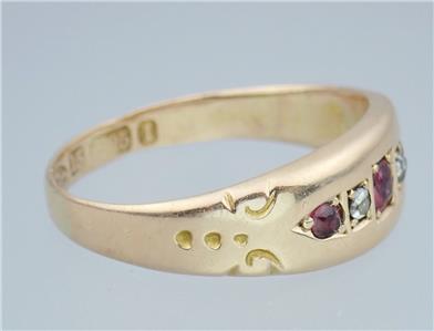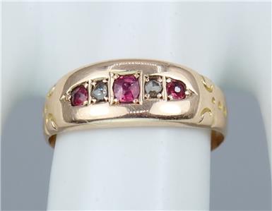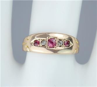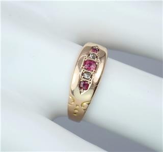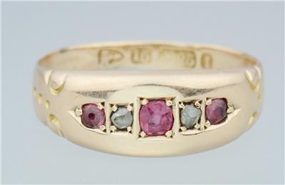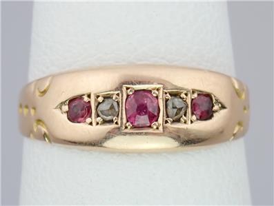 This beautiful antique Victorian solid 15k yellow gold 1/4 carat five gemstone ring has a gently graduating band with a lovely central rectangular faceted pinkish red ruby with a sparkling rectangular old rose cut diamond either side and two further rectangular pinkish red rubies on the end, the shoulders with pretty little carved scrolling decorations. The ring has English hallmarks inside the band with the Chester town mark, '15 .625' for 15k gold and date letter 'I' for 1892. The ring tests for 15k gold.