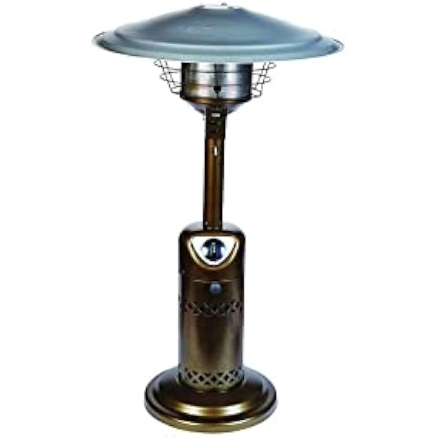 10,000 BTU heating output rate, push & turn ignition. Stainless steel emitter and protective screen shield. Efficient burner system with flame failure device and anti-tilt switch. Hammer tone bronze finish. Tank compartment suitable for 1lb portable gas cylinder Brand Name: Living Accents Color: Copper Depth: 20 in. Heater Type: Patio Height: 34 in. Housing Material: Steel Packaging Type: Boxed Portable: Yes Power or Fuel Type: Propane Style: Tabletop Width: 20 in.