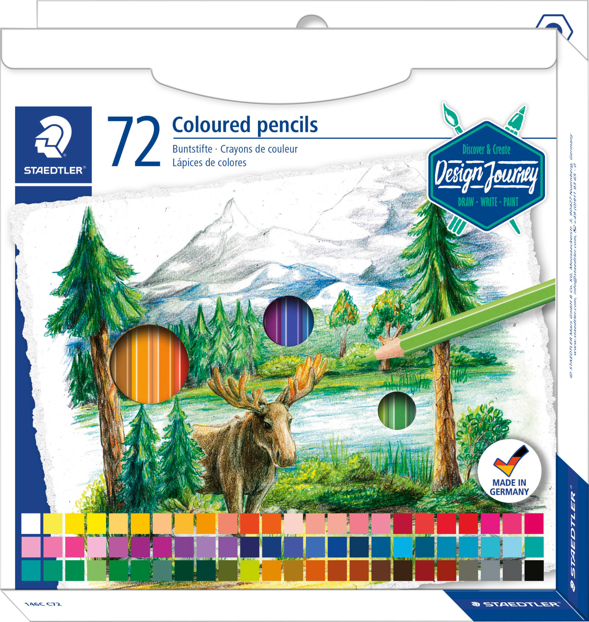 STAEDTLER Buntstifte, 72 Stück in farbintensiven, hochpigmentierten Farben. Im klassischen Sechskantformat mit einem Minen-Ø von ca. 3 mm. Weich im Abstrich und leicht spitzbar. Die große Auswahl ermöglicht tolle Farbkombinationen für kreative Kunstwerke auf Papier, Pappe und Karton in Form von eindrucksvollen Landschaften, Szenarien, Mandalas und mehr. Hier kommen Hobbykünstler, Jugendliche und Erwachsene auf ihre Kosten. Aus der Gestaltungsserie "Design Journey" und mit Holz aus PEFC-zertifizierten, nachhaltig bewirtschafteten Wäldern.