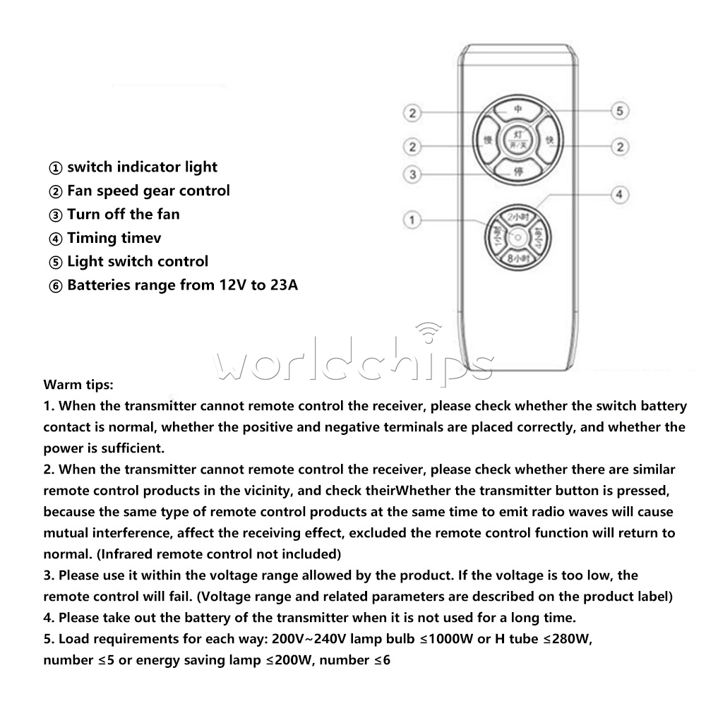 2. When the transmitter can not remote control the receiver, please check whether similar remote control products exist in the vicinity, and check whether their transmitter keys are pressed, because the same nature of the remote control products at the same time to transmit radio waves will cause mutual interference, affecting the reception effect, excluding the remote control function will be restored to normal. (Infrared remote control is not included)