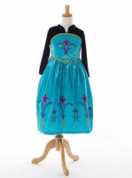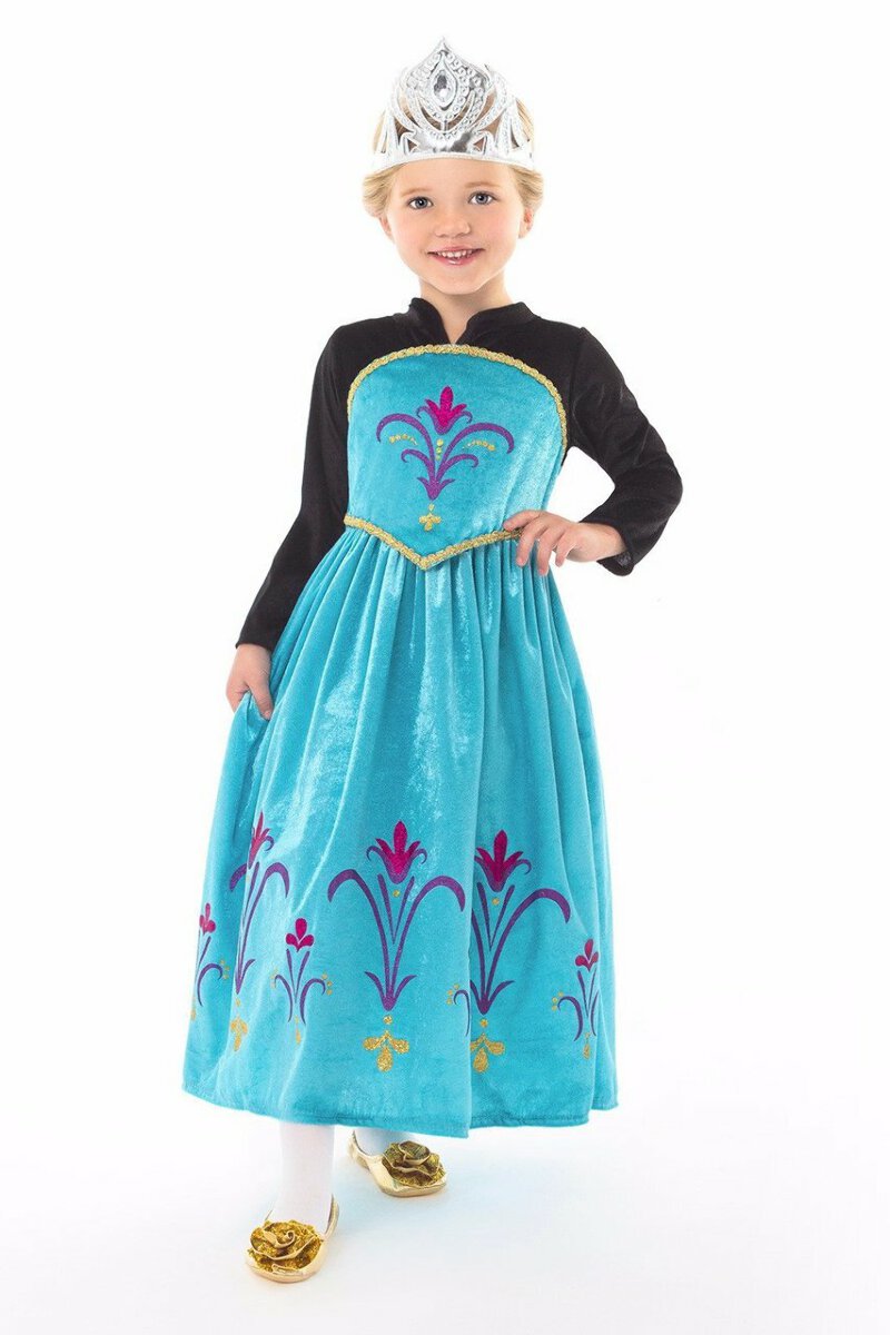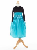 Let your little one fulfill her dream of becoming the Ice Queen with our Ice Queen Coronation Dress. The velvet turquoise fabric of this dress is so stretchy and soft that your little princess will be swirling and making ice sculptures in minutes. The black stretch velvet sleeves and chest create a royal effect, fit for a queen. Enjoy the unique, glittery, Norwegian tulip print that delicately lays on the bodice and along the bottom of the dress. The dress is finished with a braided gold trim along the edges. With this Ice Queen Coronation Dress she will be ready for her big debut in the castle.