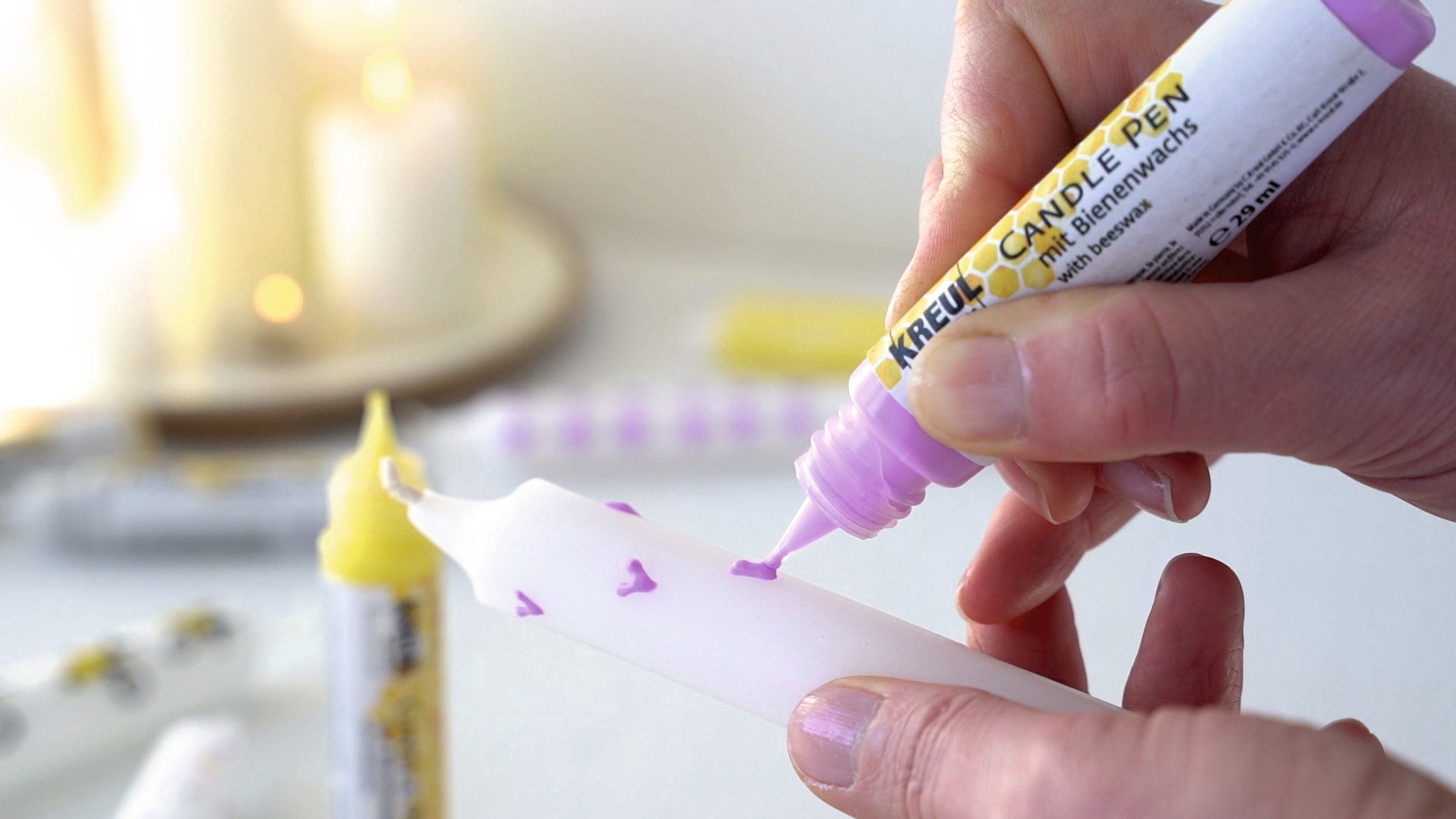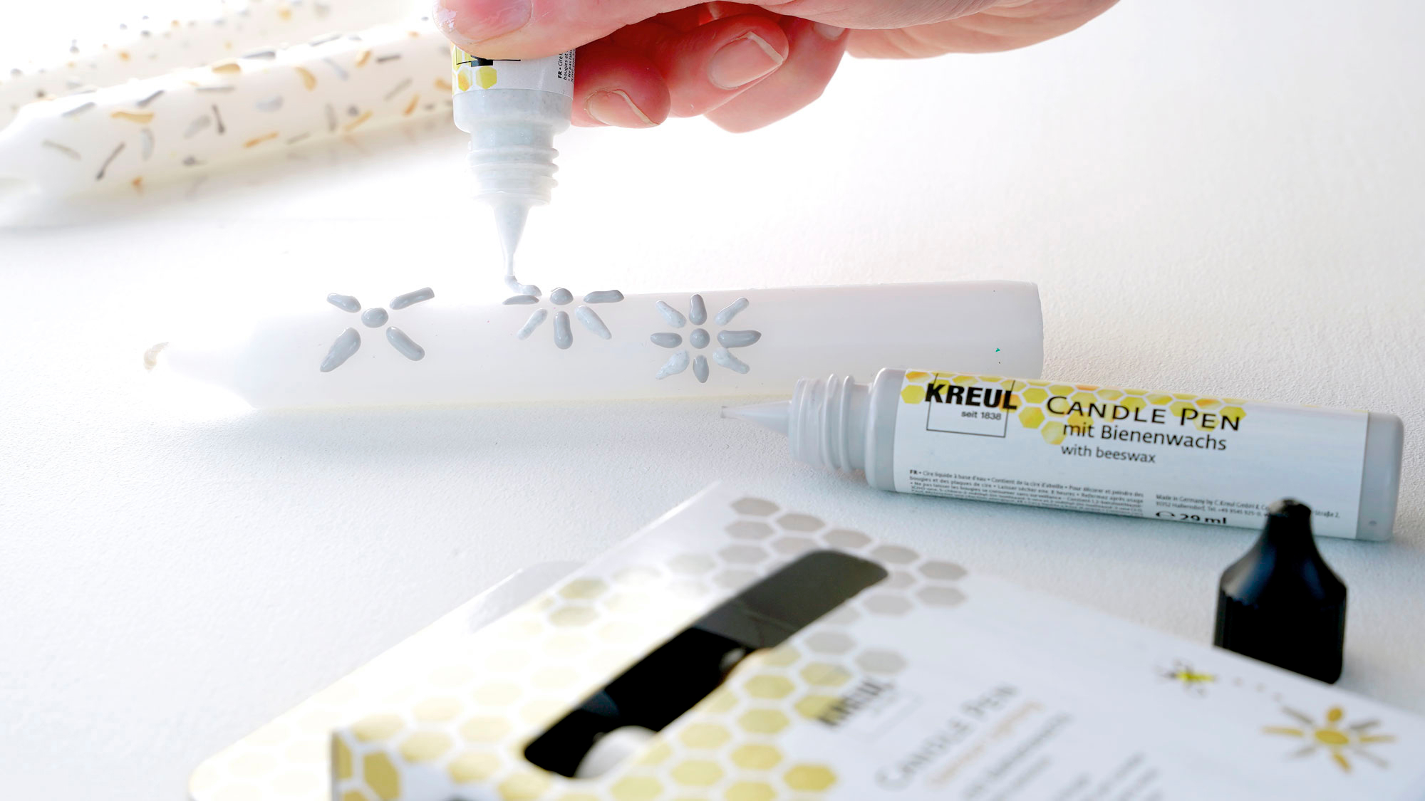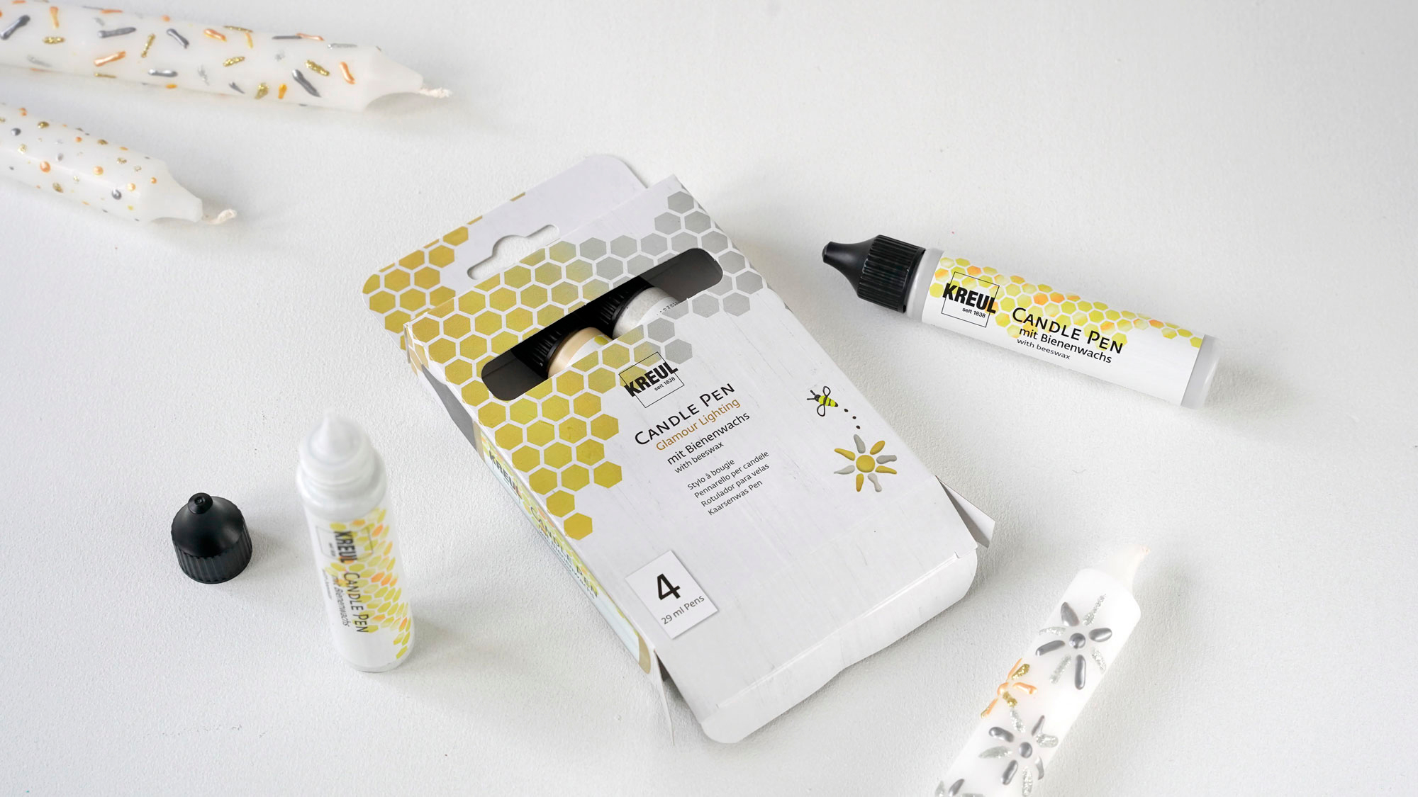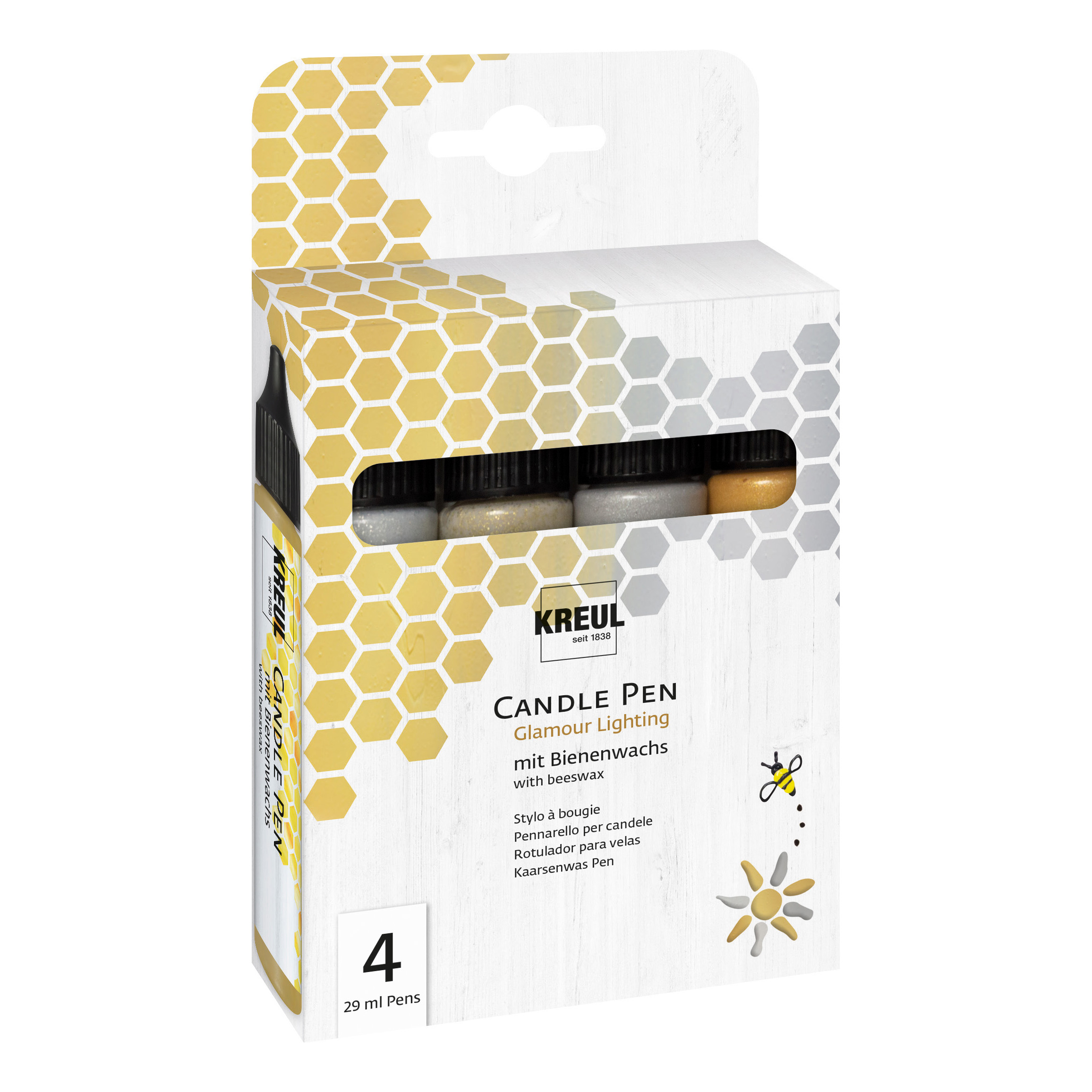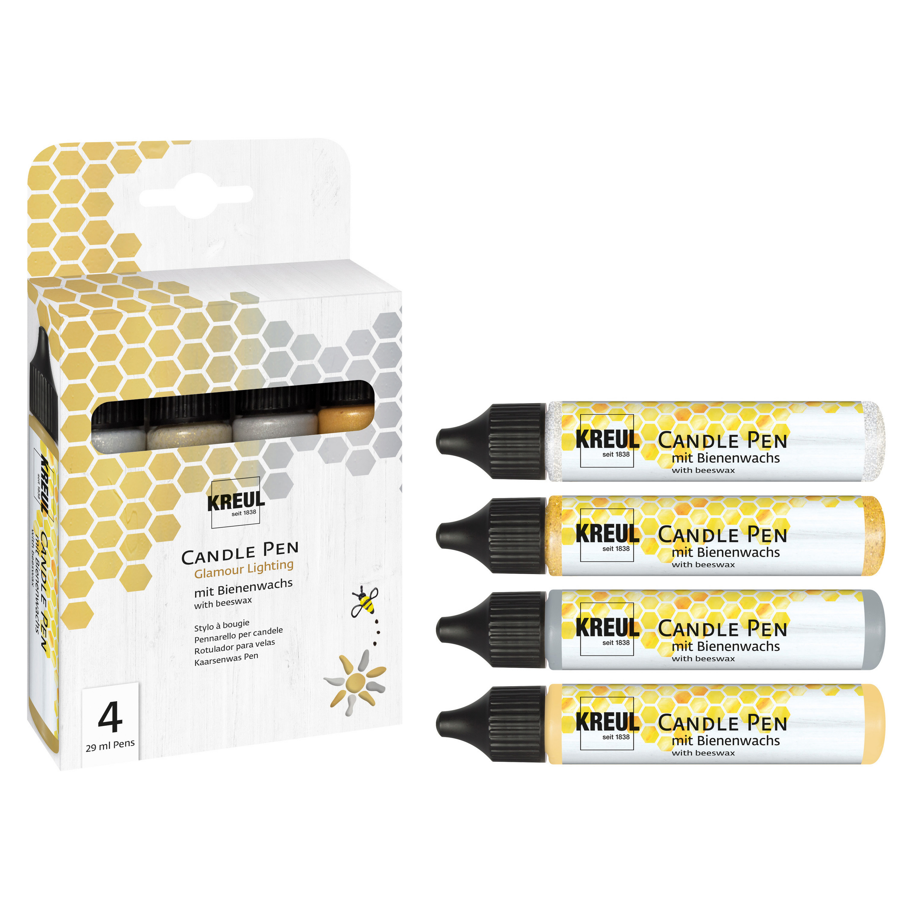 KREUL Candle Pen "Glamour Lighting", 4er-Set zum Bemalen, Verzieren und Beschriften von Kerzen im edlen Design für festliche Anlässe. Es sind die Farben Gold, Silber, Glitter-Gold und Glitter-Silber mit einer Füllmenge von jeweils ca. 29 ml enthalten. Auf Wasserbasis und mit Bienenwachs. Kerzen und Wachsplatten lassen sich individuell mit Namen, Schriften, Motiven und Co. gestalten. Der Auftrag kann direkt aus dem Liner erfolgen oder mit dem Pinsel, Schwamm oder Spachtel. Die edlen Farben lassen sich schichtweise übereinander auftragen und die Trocknungszeit beträgt ca. 8 Stunden. Mit wenigen Handgriffen werden persönliche Geschenkideen und Dekorationen für die Liebsten geschaffen.
