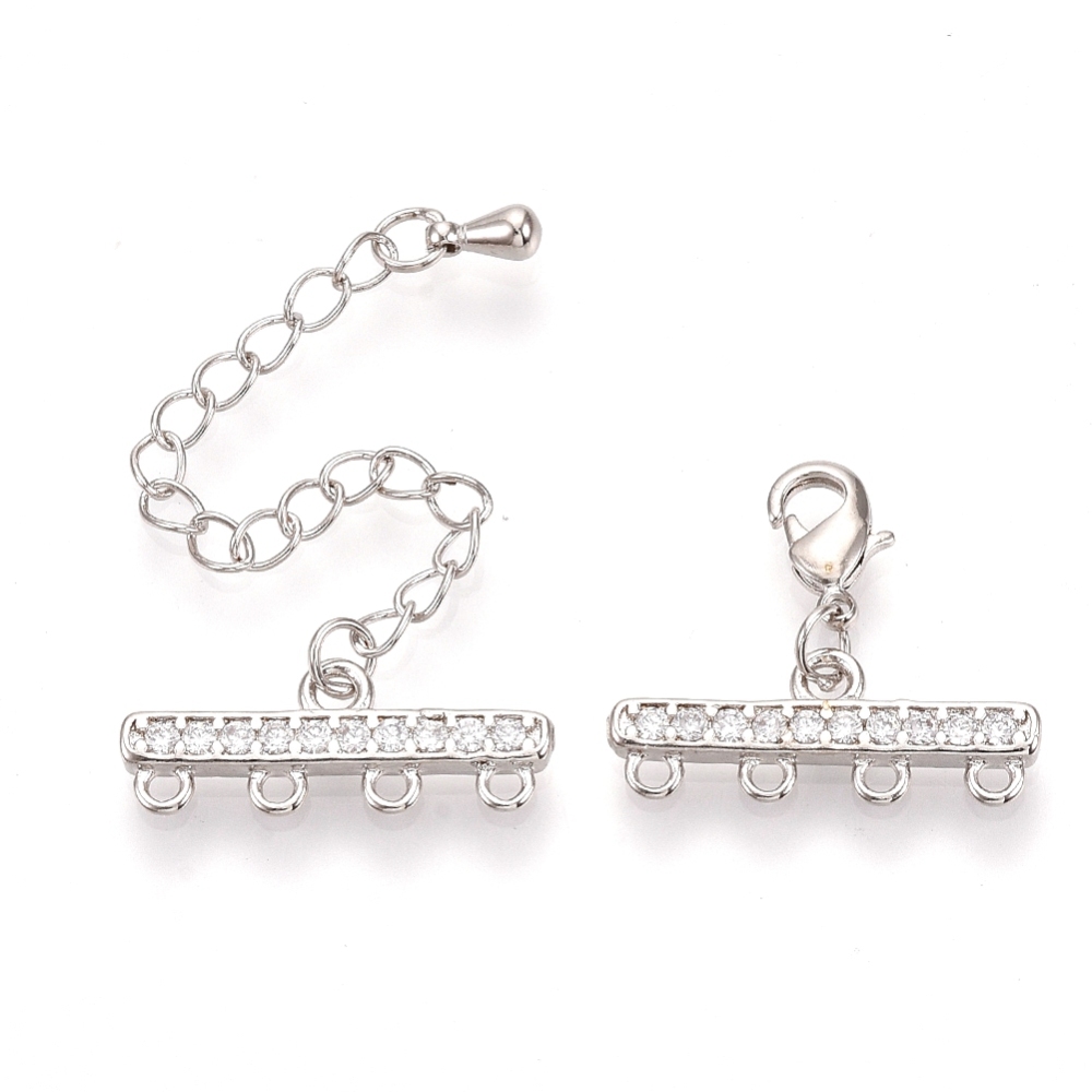 Brass Micro Pave Cubic Zirconia Chain Extender, Necklace Layering Clasps, with 4 Strands 8-Hole Ends and Lobster Claw Clasps, Nickel Free, Clear, Real Platinum Plated