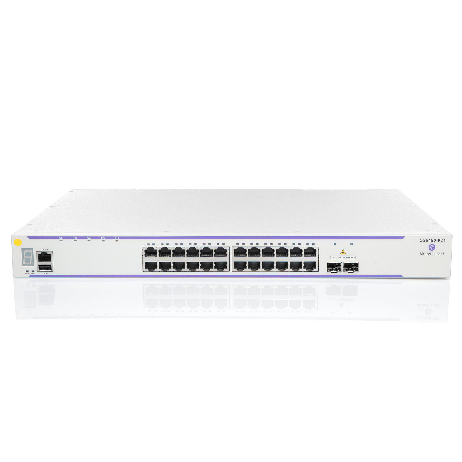 OS6450-24: Gigabit-Ethernet- Chassis im 1U-Formfaktor mit 24 10/100/1000 BaseT-Ports, 2 festen SFP+ (1G/10G*)-Ports und einem Erweiterungssteckplatz für optionale Stacking- oder Uplink-Module.