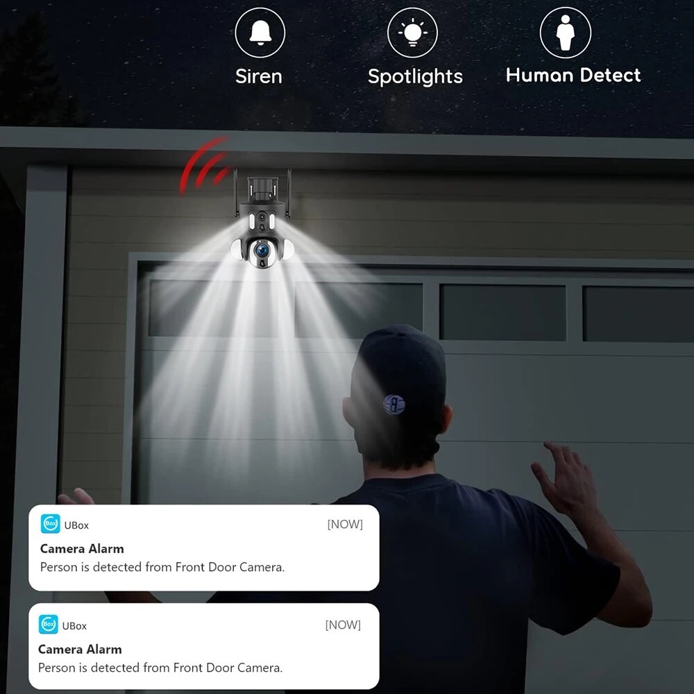 When the camera detects a suspicious person or object, its siren and spotlight will be activated to warn off the unwelcome. (You can also manually turn on/off the siren and spotlight)