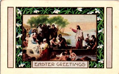Easter Greetings Jesus Preaching From Boat On Sea of Galilee To Crowds Postcard