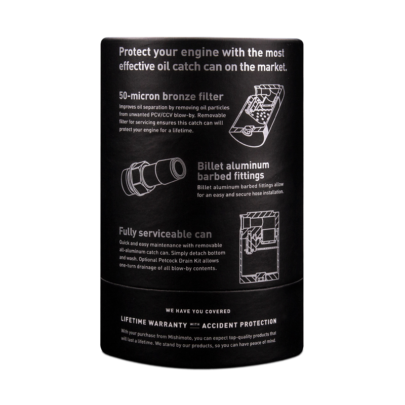 | Includes | Purchase Includes: (1) Compact 2-Port Baffled Oil Catch Can (2) Aluminum 1/2" Barbed Fittings (1) Universal Mounting Bracket Mishimoto Lifetime Warranty |