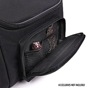 An easy-access zippered pocket can store your dice and small accessories. Two mesh elastic pockets help keep things tidy and are great to hold other loose goodies.