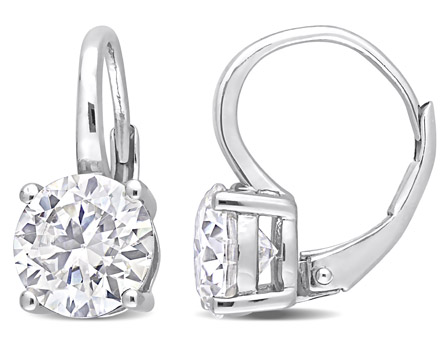 These moissanite solitaire drop leverback earrings are crafted in sterling silver. These elegant earrings feature two round-cut created white moissanite gemstones in a classic solitaire drop design. Enhanced with a high polish finish, these gemstone earrings are the perfect gift for your beloved. A beautiful addition to any jewelry collection.