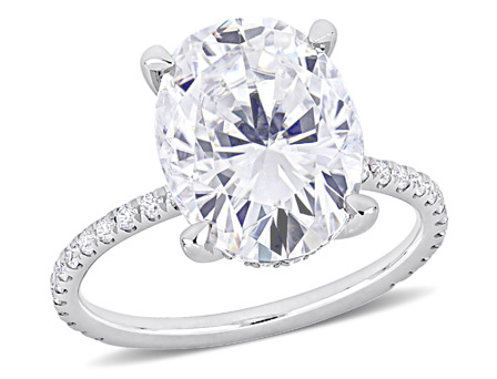 Be the role model couple with this ravishing Engagement Ring. Crafted in glistening white gold, this glamorous ring showcases an oval-cut, prong-set created moissanite gemstone (13x10mm) at the center and 48 round-cut, buttercup-set created moissanite gemstones (1.3x1.3mm) placed on 3/4 shoulder set band. Enhanced with a high polished finish, this flawless ring will be the symbol of your eternity.