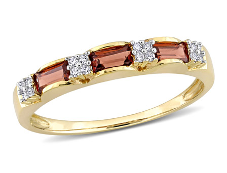 This fabulous stacking three-stone anniversary ring is crafted in 10-karat yellow gold. This pretty wedding ring features alternating baguette-cut garnet and round-cut white topaz gemstones. Enhanced with a high polish finish, this stackable eternity ring is the perfect addition to any jewelry collection. Whether worn as an anniversary band, wedding band or simply a gorgeous gemstone accessory, this ring is a great gift for a woman with a classic and trendy sense of style.