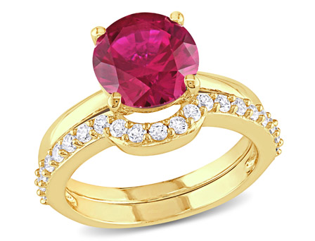 Ignite the flames of love with the Women's 2 4/5 CT TGW Created Ruby and Created White Sapphire Bridal Set, crafted in exquisite 10k Yellow Gold. This enchanting 2-piece set is a testament to the beauty and passion that radiates from within.Centered around a captivating 2 4/5 CT TGW created ruby, this bridal set exudes a fiery brilliance that symbolizes love, courage, and vitality. The rich red hue of the created ruby is complemented by the surrounding created white sapphires, which shimmer with elegance and grace. Together, these gemstones create a mesmerizing display of color and sparkle, capturing the essence of true romance.The engagement ring features a stunning solitaire design, allowing the created ruby to take center stage and command attention. The simplicity of the setting enhances the allure of the gemstone, creating a timeless and sophisticated look. The matching wedding band adds a touch of elegance, perfectly accentuating the beauty of the engagement ring.