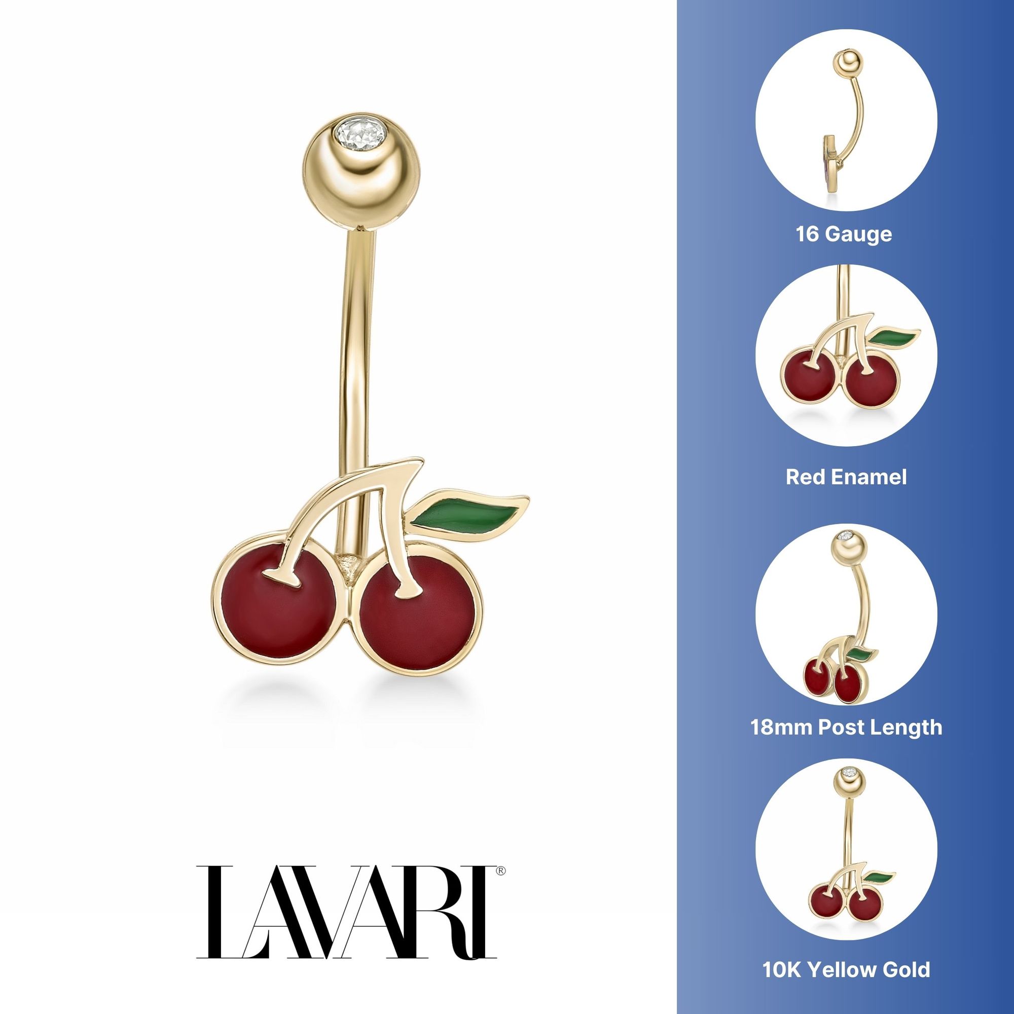 Stand out from the crowd and make a statement with our 16 Gauge 10K Yellow Gold Red Enamel Cherry Belly Ring. Its unique and eye-catching design will instantly draw attention and compliments. Made with premium materials, this belly ring is not only stylish but also durable, ensuring it will be a cherished piece in your jewelry collection for years to come. Treat yourself or surprise a loved one with this delightful belly ring, and let your personality shine through with every move.