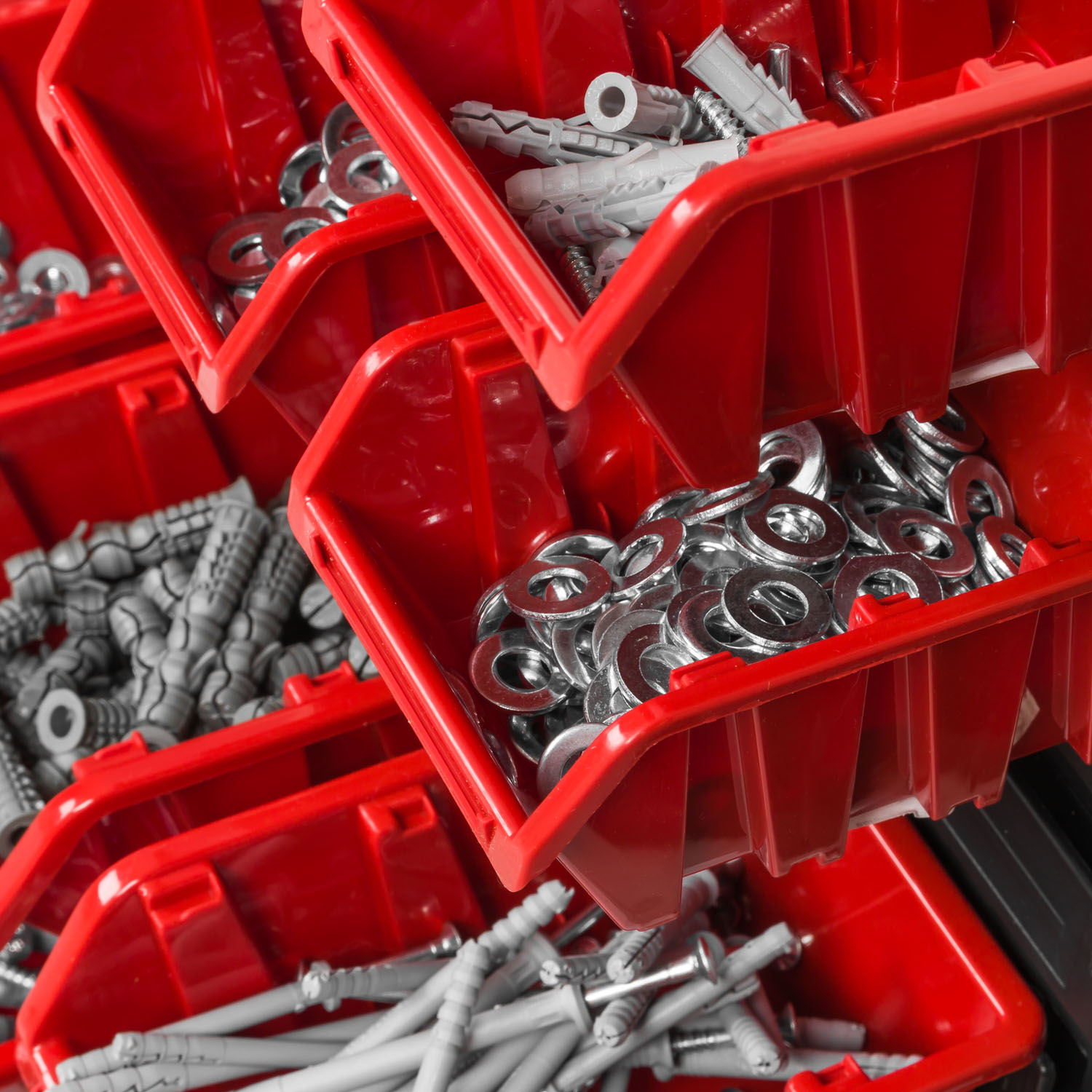 Pratiche scatole impilabili per mantenere l'ordine e la visione d'insieme nella tua officina privata. Con queste scatole di stoccaggio a vista viti, chiodi, dadi e piccole parti sono sempre ordinati e a portata di mano.