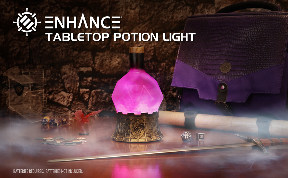 The Sorcerer’s Potion Light also serves as perfect decor for your gaming room. You can display it on your shelf, desk, or nightstand, and enjoy its soothing glow as you relax or prepare for your next campaign. The potion light makes a great centerpiece as you share your adventuring stories. It beautifully complements your other ENHANCE gaming accessories, like our Collector's Edition Metal Dice with 2-in-1 Pouch and Dice Tray, and more. Arrange multiple Potion Lights to create a stunning display with ENHANCE gaming gear and figurines of your favorite characters, monsters, and scenes.